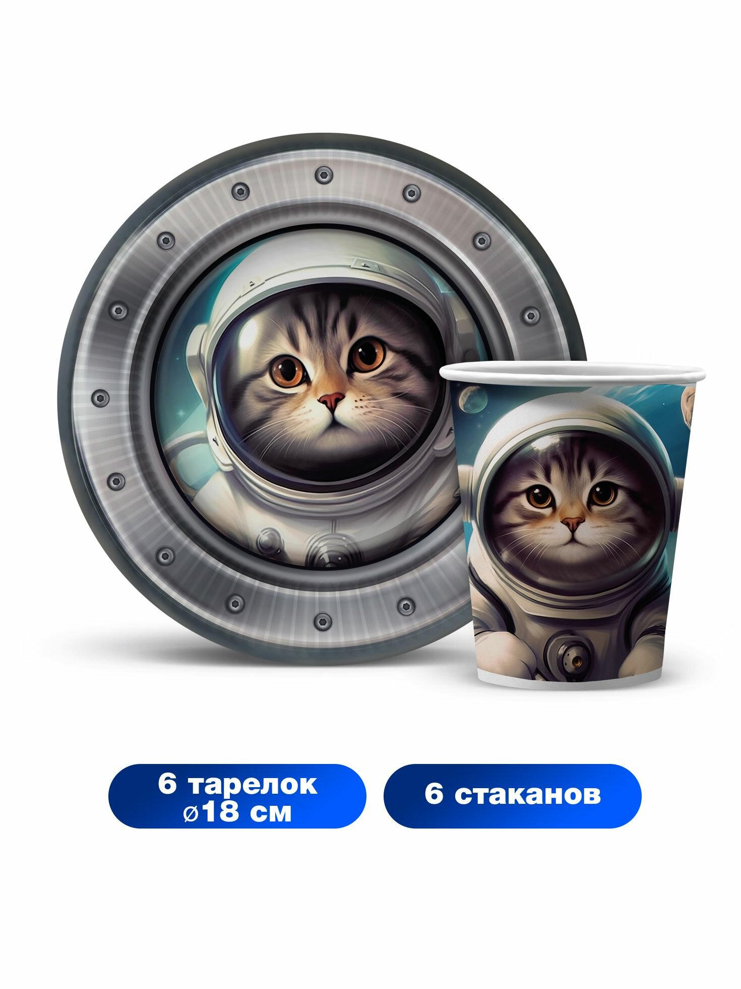 Набор одноразовой бумажной посуды для праздника ND Play / Кот-космонавт (тарелка 18 см, стакан, по 6 шт.) информация:
