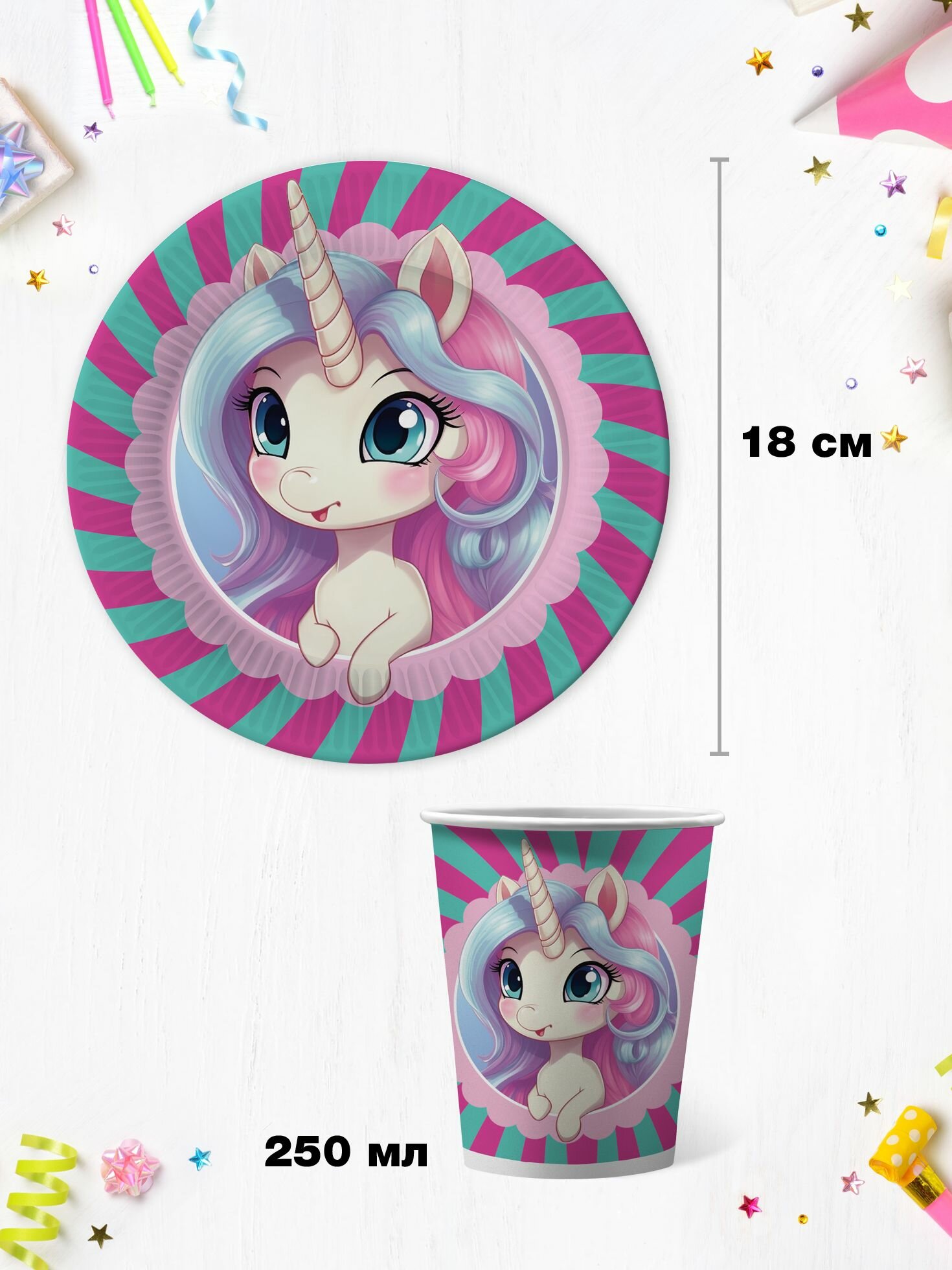 Набор одноразовой бумажной посуды для праздника ND Play / Единорожка (тарелка 18 см, стакан, по 6 шт.) информация: