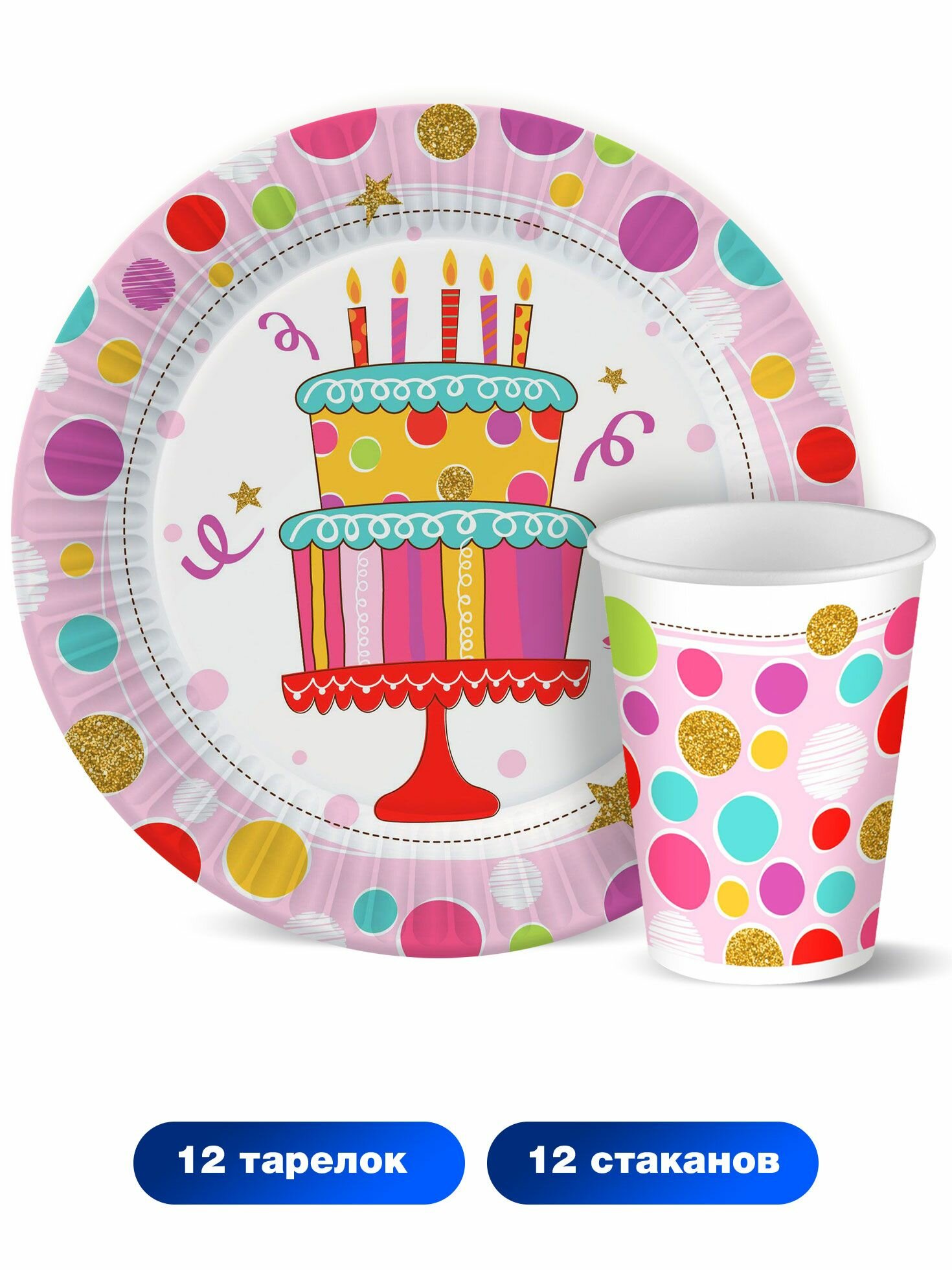 Набор одноразовой бумажной посуды для праздника ND Play / Тортик (стакан, тарелка 18 см, по 12 шт.) информация: