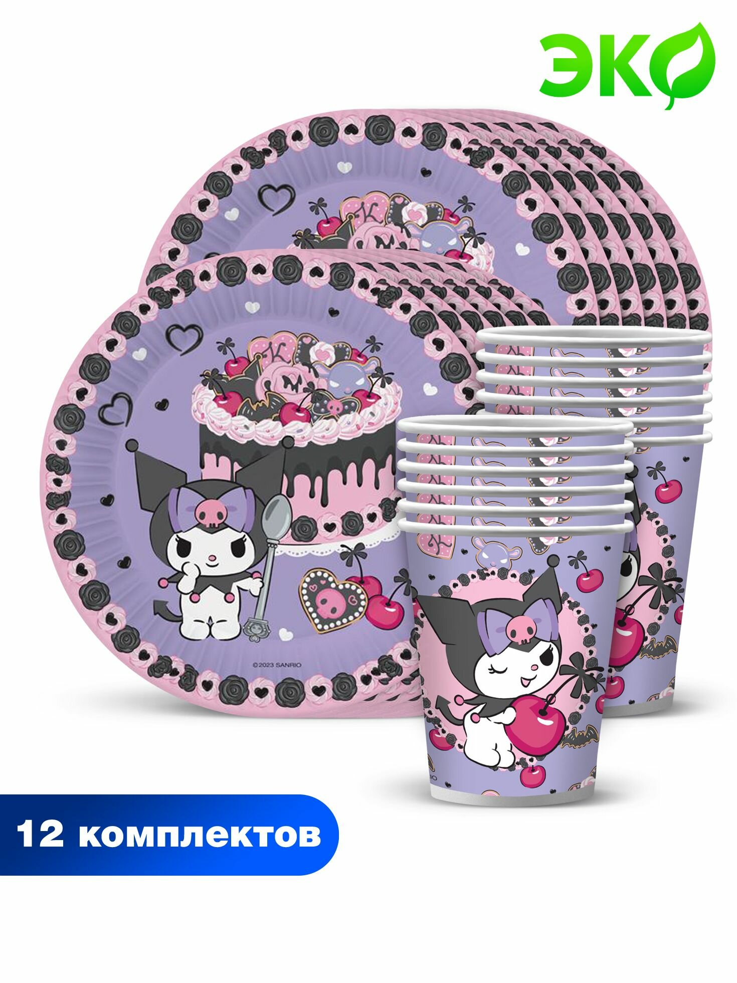Набор одноразовой бумажной посуды для праздника ND Play / Kuromi (тарелка 18 см. , стакан, по 12 шт.) информация: