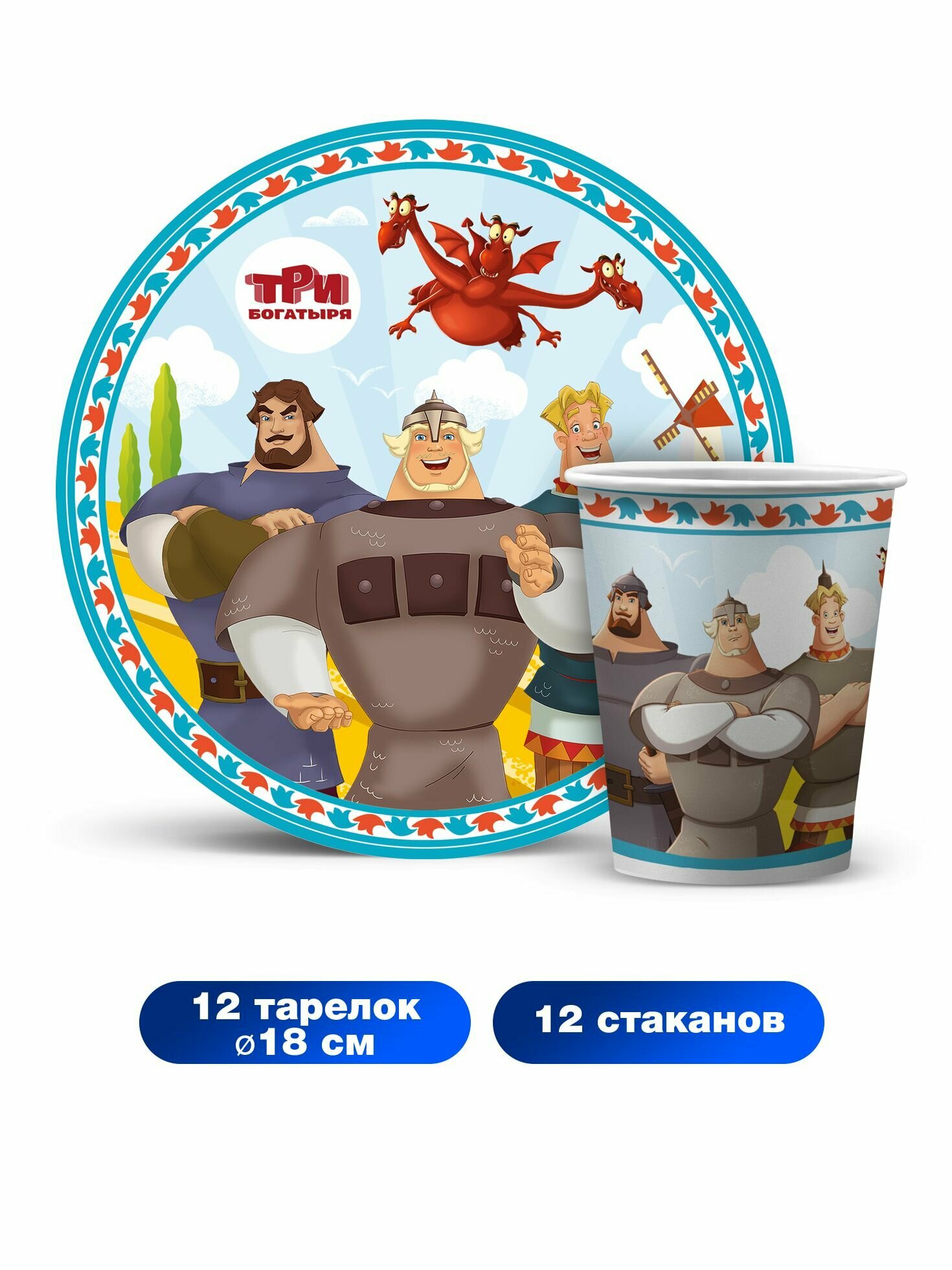 Набор одноразовой бумажной посуды для праздника ND Play / Три Богатыря (тарелка 18 см. , стакан, по 12 шт.) информация: