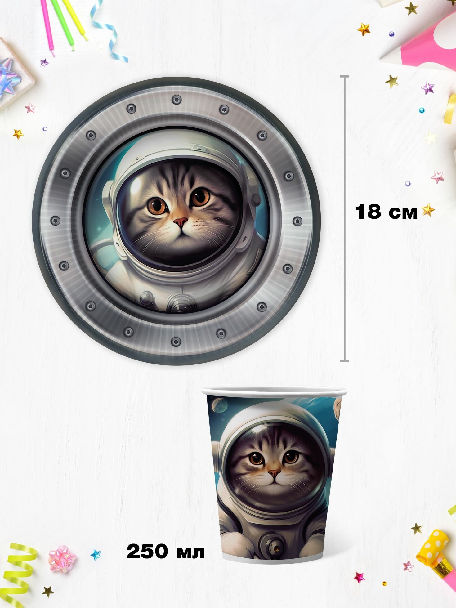 Набор одноразовой бумажной посуды для праздника ND Play / Кот-космонавт (тарелка 18 см, стакан, по 18 шт.) информация: