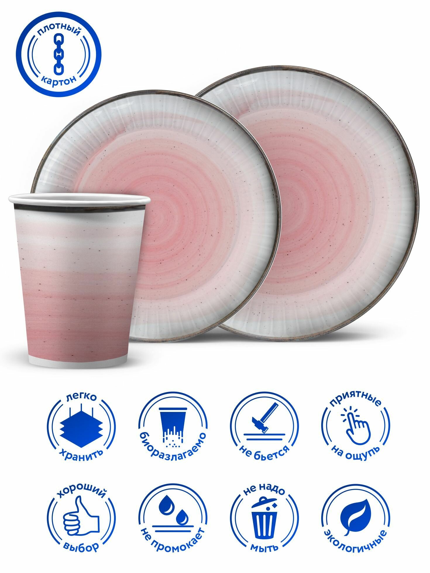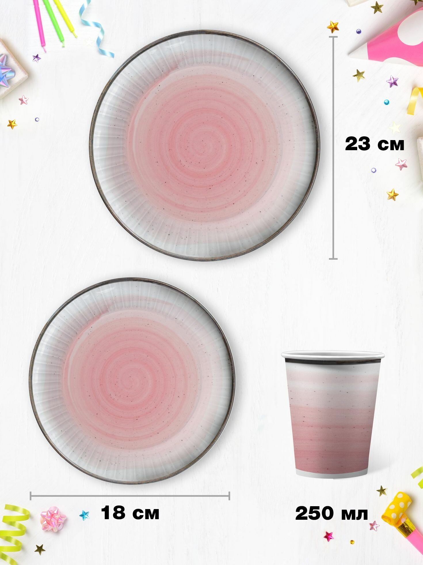 Набор одноразовой бумажной посуды для праздника ND Play / Керамика розовая (тарелка 23 см, тарелка 18 см, стакан по 12 шт.) информация: