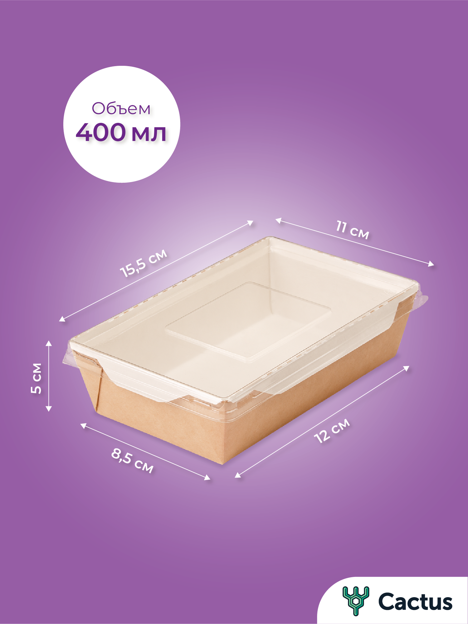 Контейнер одноразовый для еды, салатник: крафт коробка для хранения с крышкой и транспортировки продуктов 400 мл, 10 штук, Cactus информация: