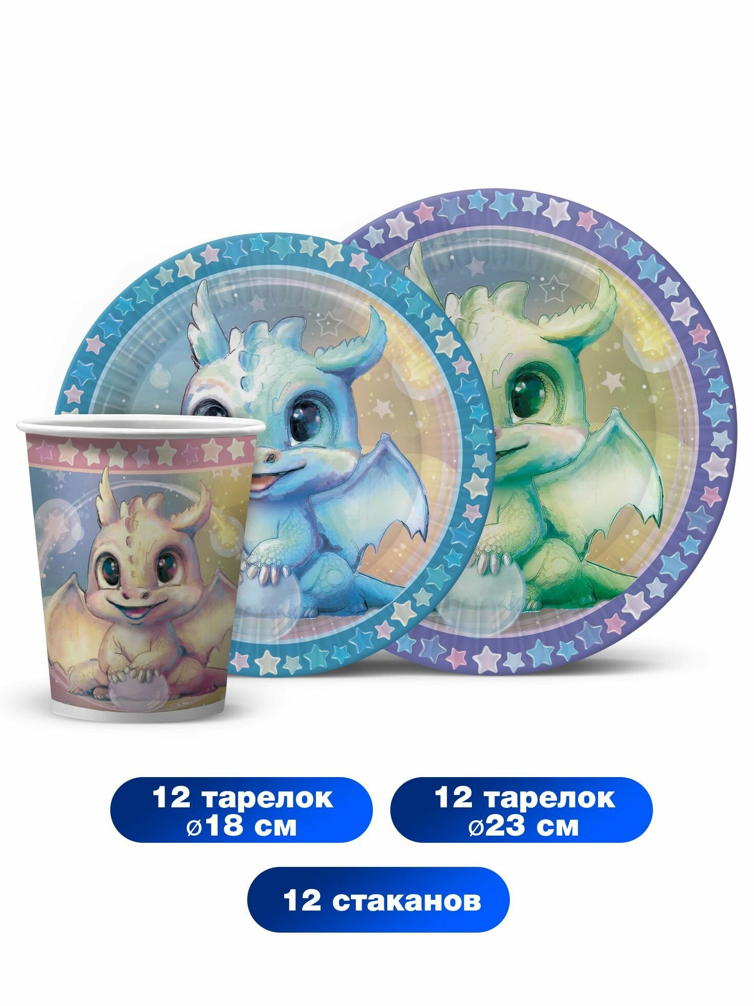 Набор одноразовой бумажной посуды для праздника ND Play. Дракоша (стакан, тарелка 18 см, тарелка 23 см, по 12 шт.) информация: