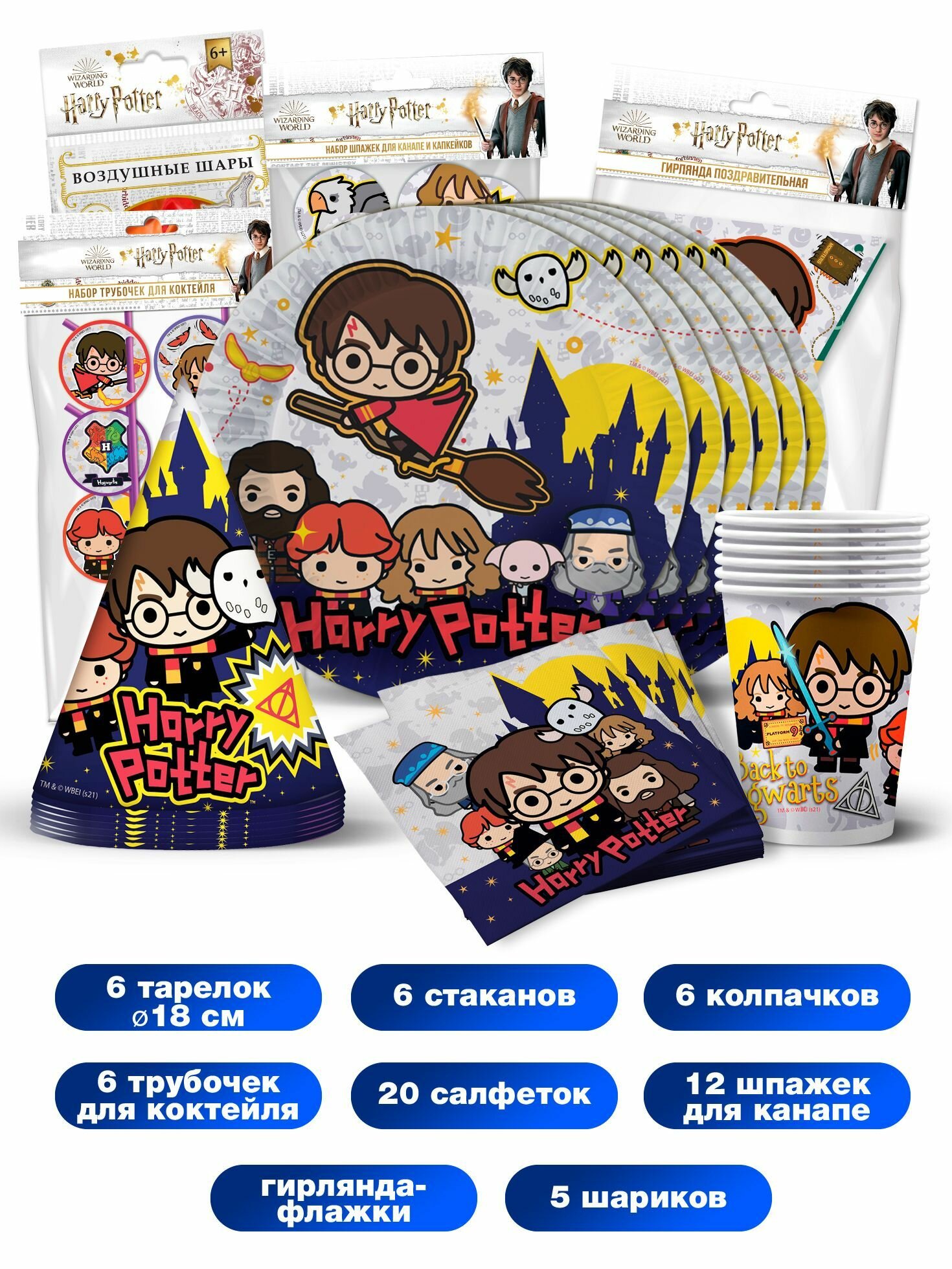 Набор для праздника ND Play / Гарри Поттер чиби №3 (стакан, тарелка мал, трубочки, колпачки по 6 шт, салфетки, шпажки, шарики, гирлянда) информация: