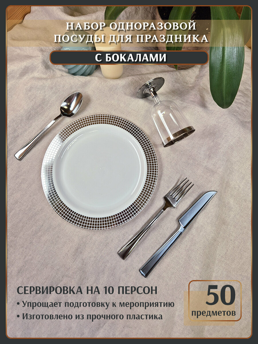 10 цен на Набор одноразовой посуды с бокалами для праздника 10 персон
