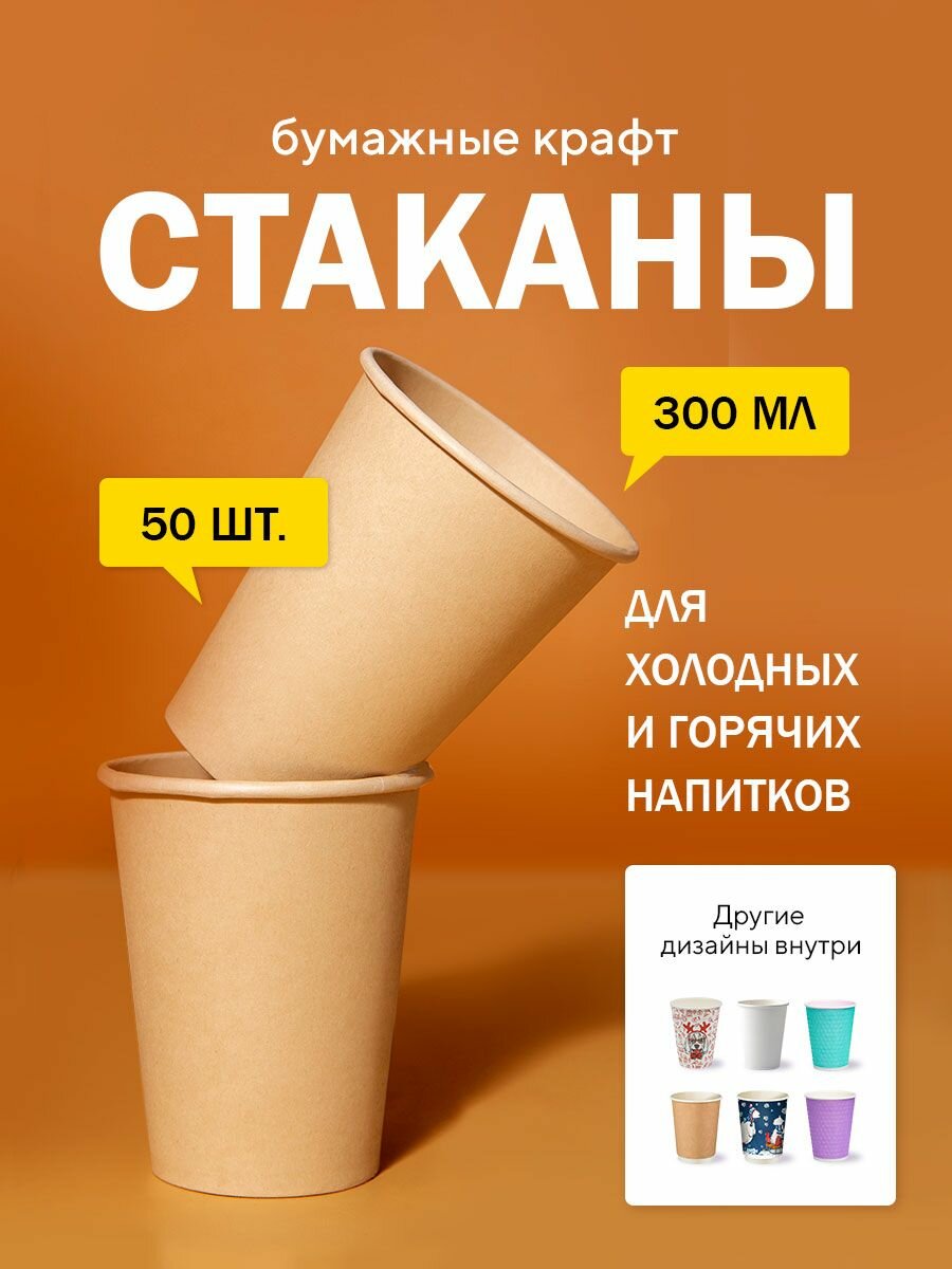 Бумажные одноразовые стаканы, 300 мл, Крафт двухсторонний, однослойные, для кофе, чая, холодных и горячих напитков, 50 шт в упаковке информация: