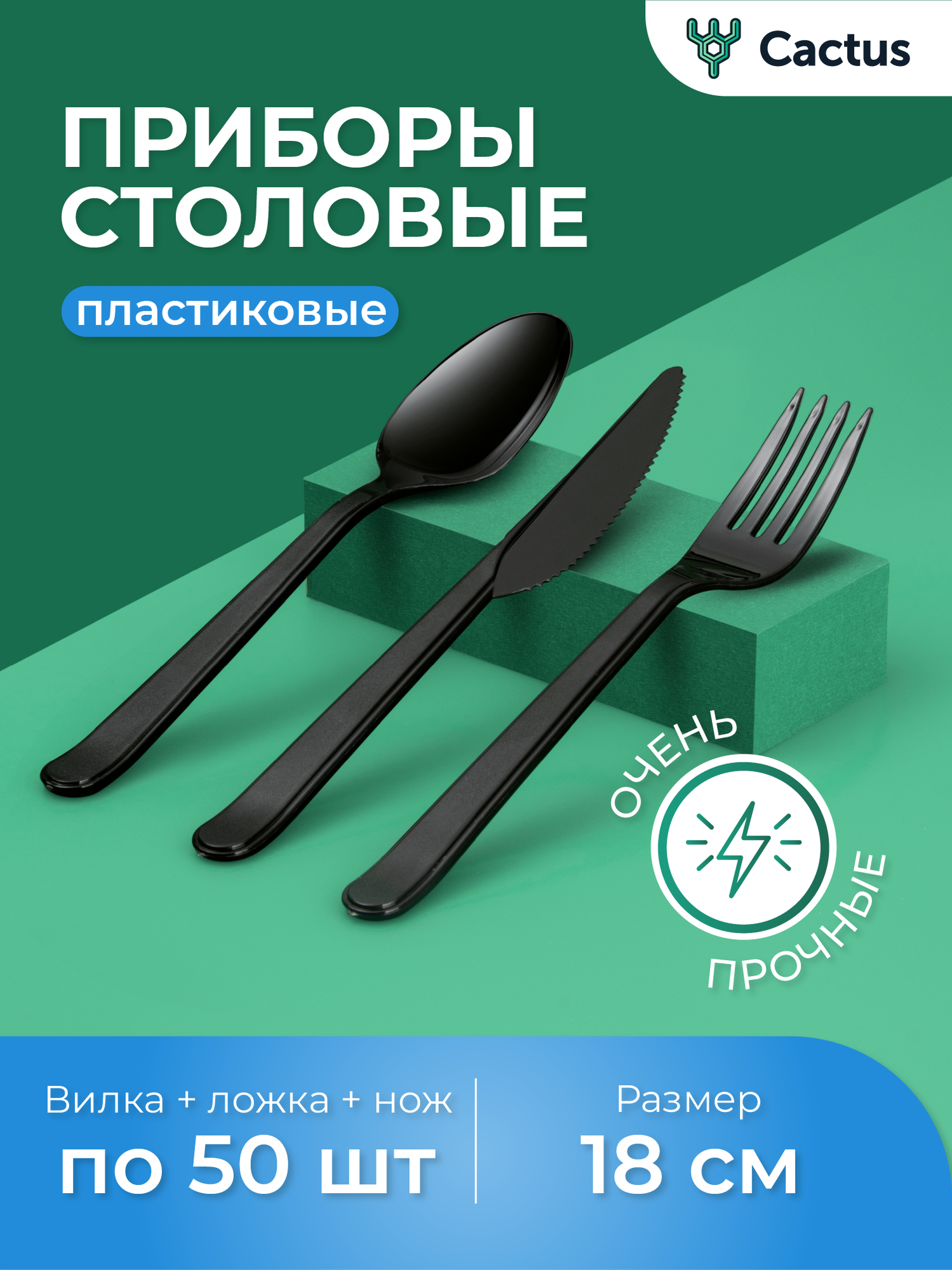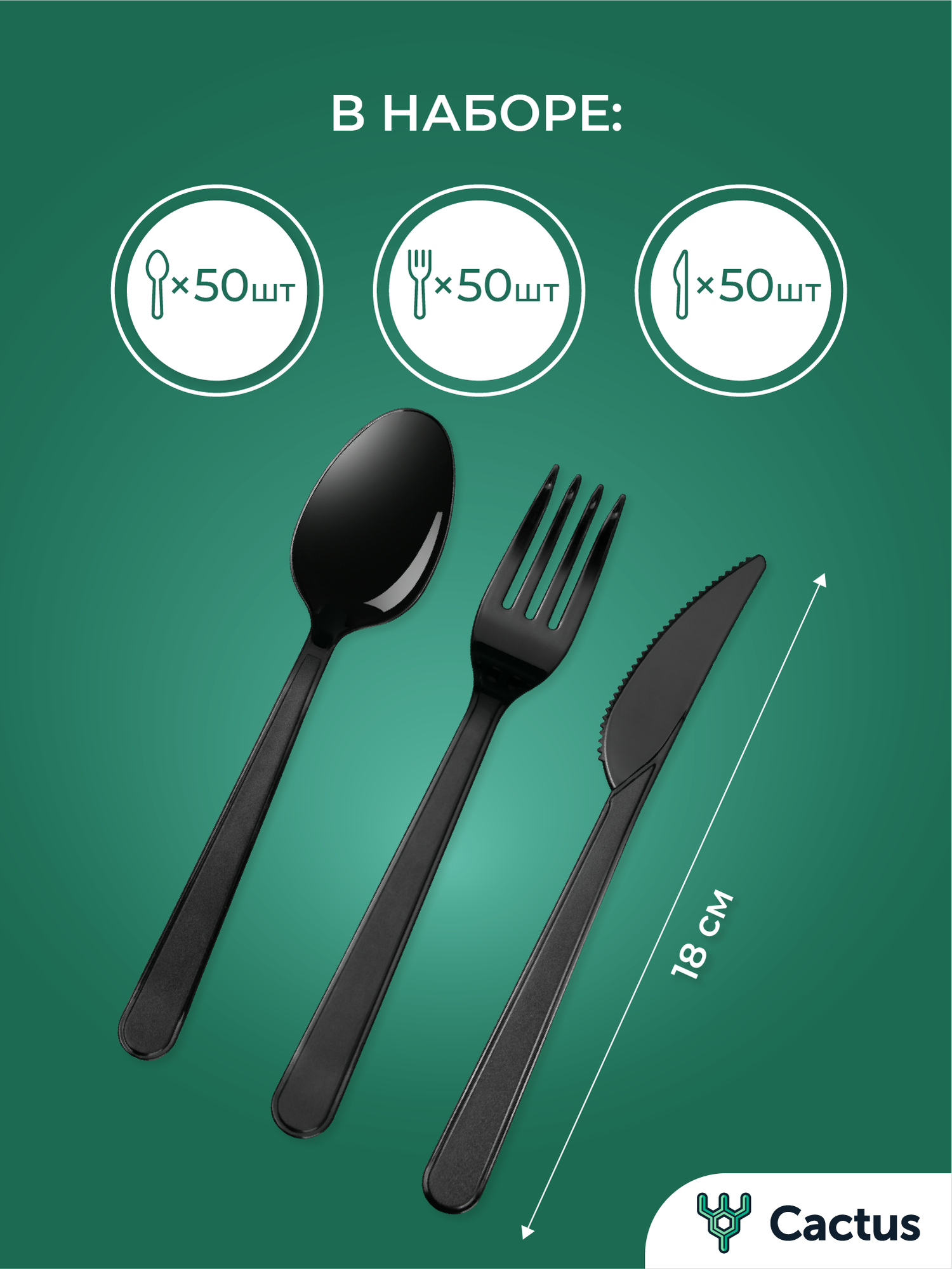 Набор одноразовой пластиковой посуды, вилка 50шт + ложка 50шт + нож 50 шт, черные, Cactus информация: