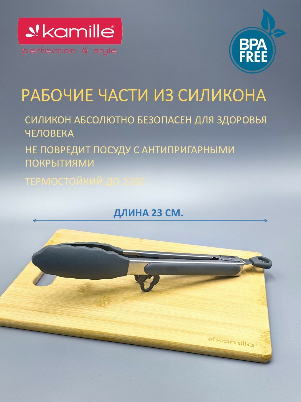 Щипцы силиконовые 23 см. Kamille КМ 7511 с ручками из нержавеющей стали (7511 / серый) информация: