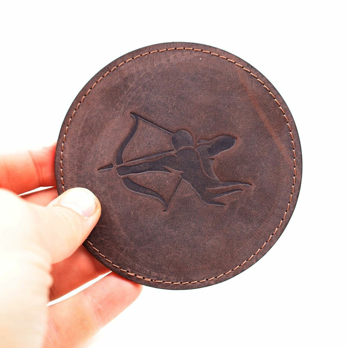 Кожаный подстаканник - бирдекель, подставка под кружку c тиснением "стрелец", Frongoch Sagittarius Brownee, J.Audmorr информация: