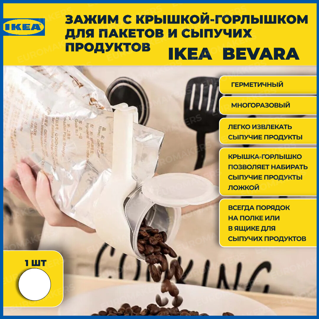 Отзывы на Зажим для пакета IKEA BEVARA. 12 см. Зажим кухонный с горлышком-крышкой для пакета. Икеа Бевара. 1 ШТ