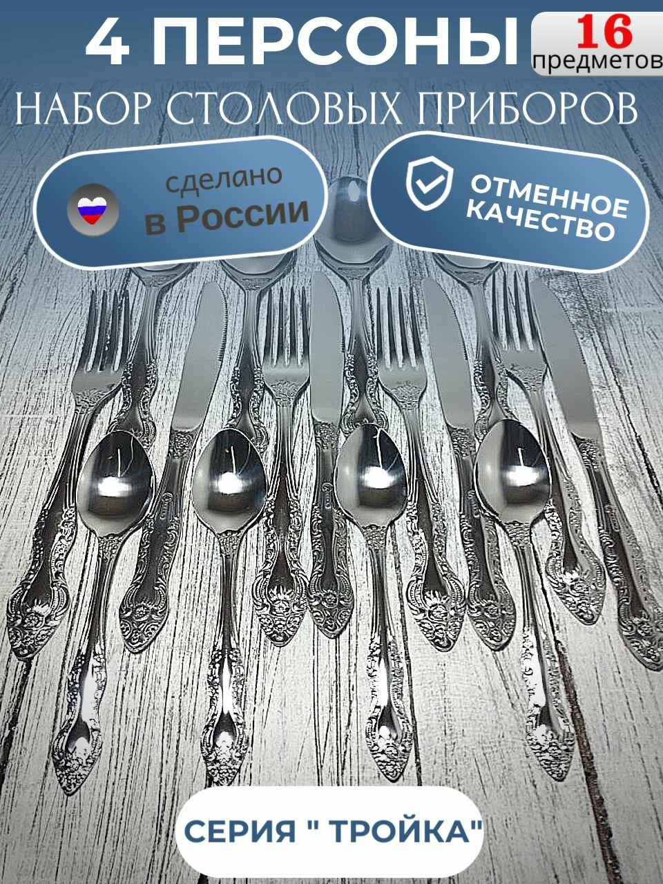 Отзывы на Набор столовых приборов, ложка, вилка, чайная ложка, нож на 4 персоны. Павловский завод. Серия тройка