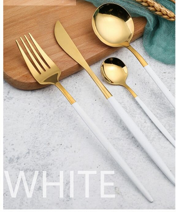 Отзывы на Подарок набор столовых приборов 4 предмета цвет золото и белый . Столовая ложка, вилка, нож и чайная ложечка.