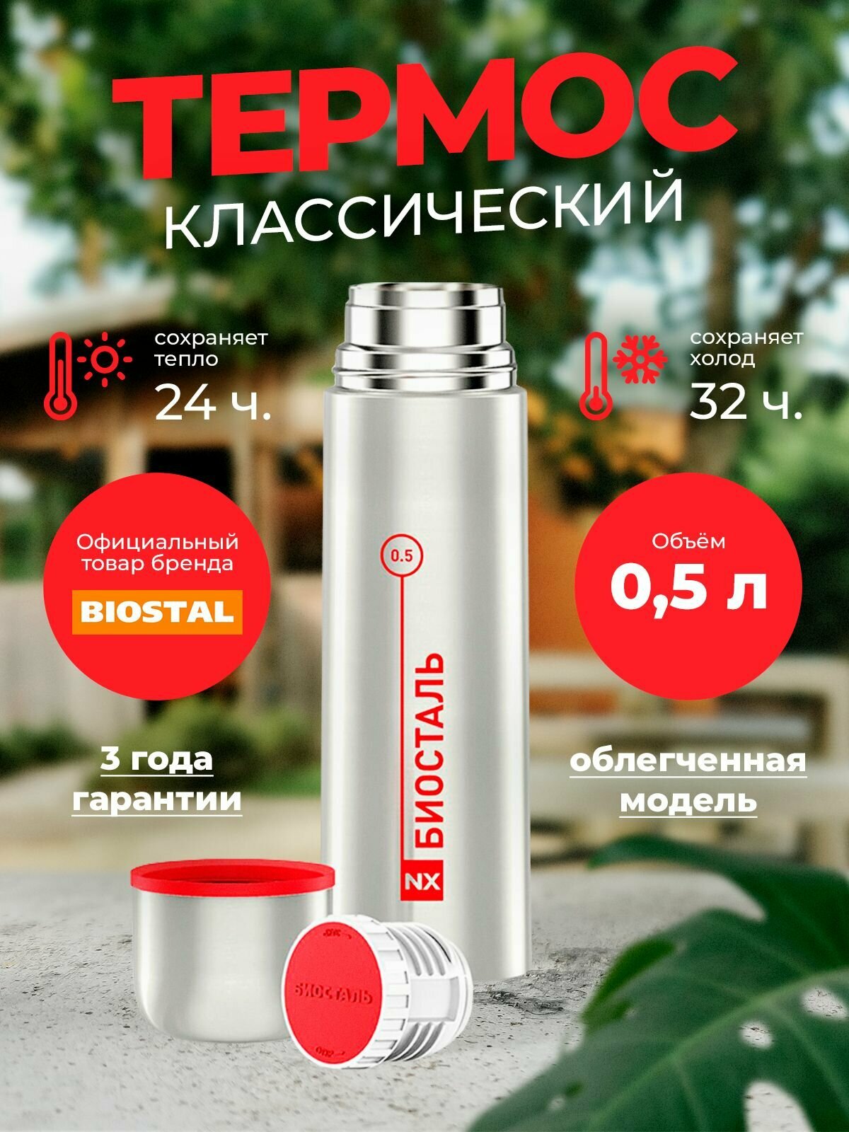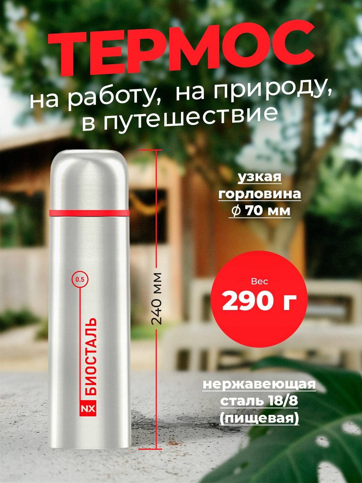 Термос 0.5 литра классический, стальной с узкой горловиной, Биосталь/Biostal (500 мл) информация:
