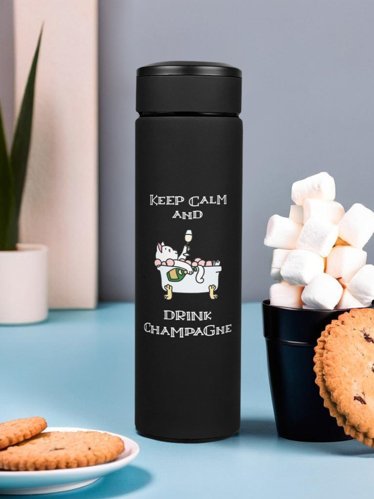 Термос черный для чая вакуумный 0,5 л. с принтом "Кот пьет шампанское" информация: