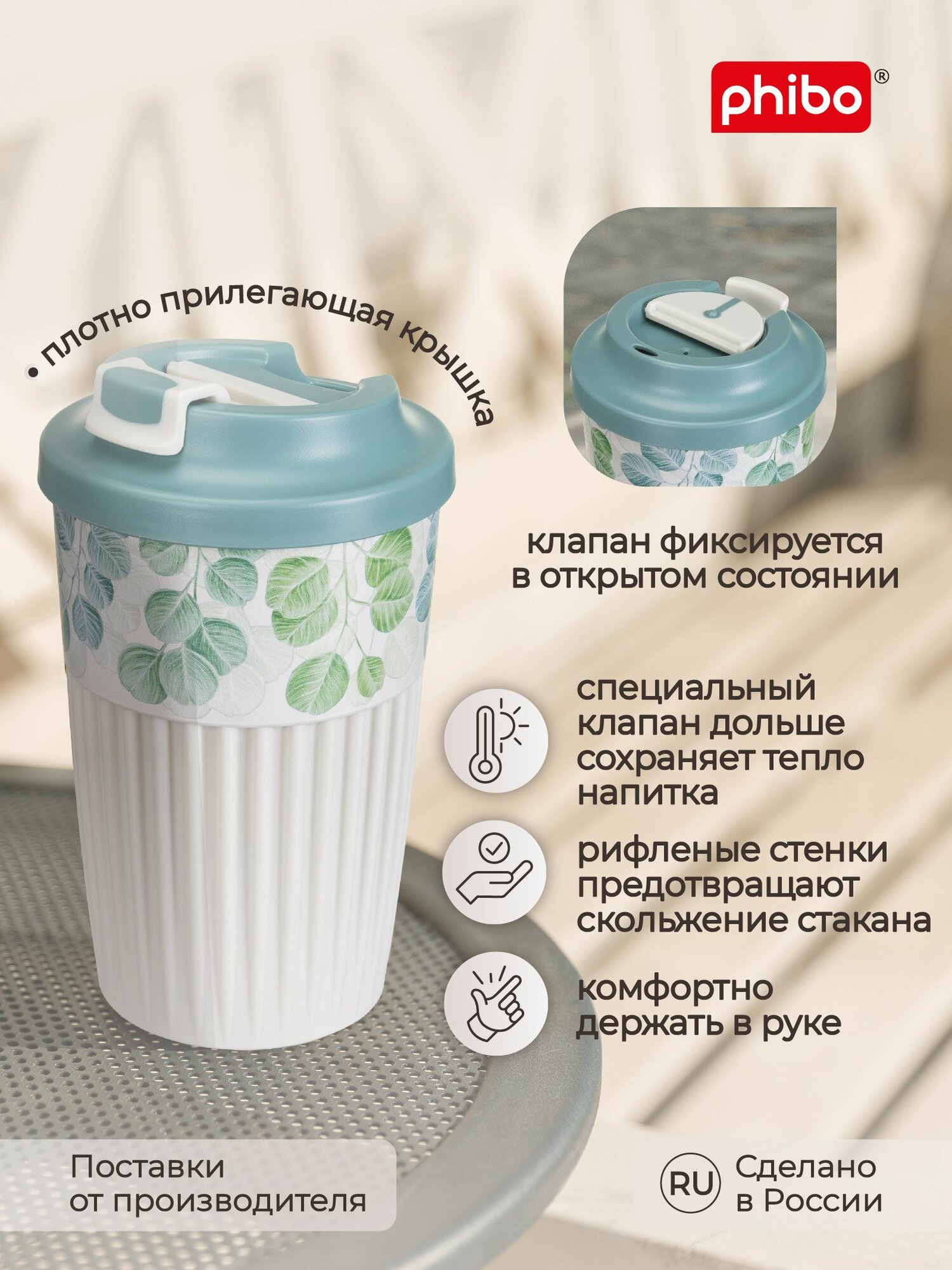 Стакан для горячих напитков с крышкой и клапаном, для кофе, чая (светло-голубой) 450 мл, Phibo информация: