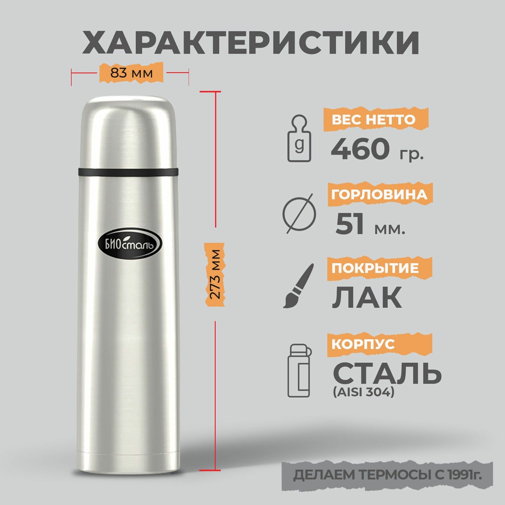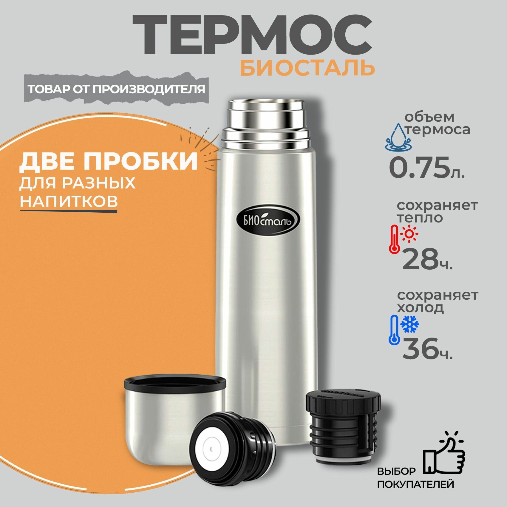 Термос 0.75 л с двумя пробками Биосталь, универсальный для чая и кофе информация: