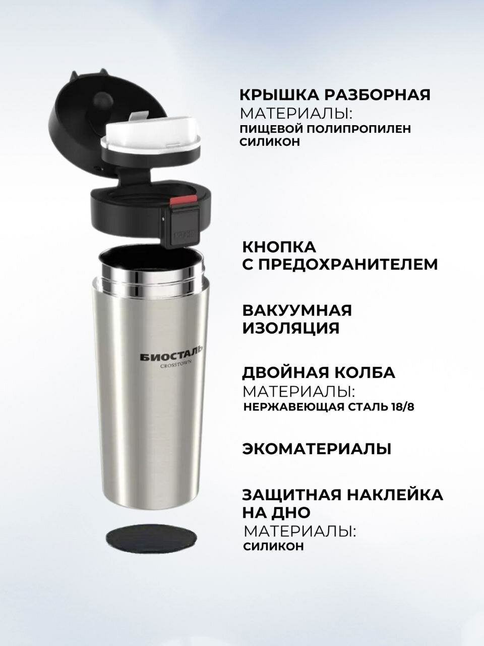 Термокружка BIOSTAL, для кофе и чая, 400мл, вакуумная, нескользящее дно, серебристая информация: