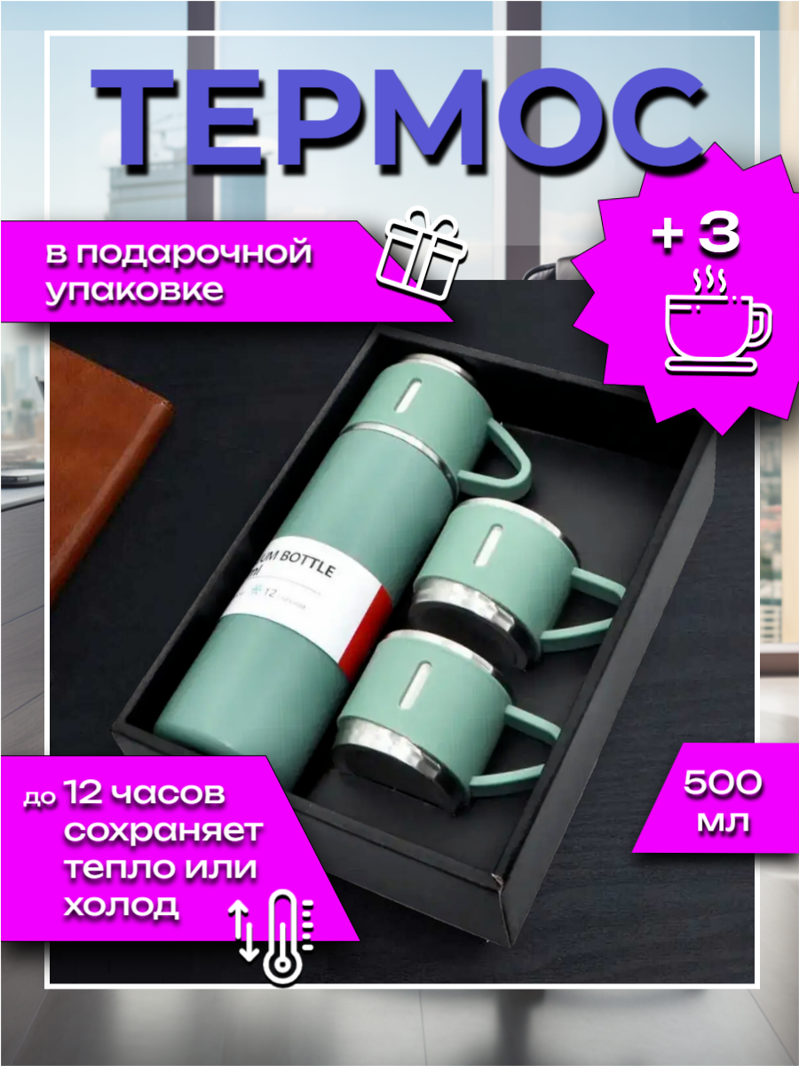 10 цен на Термокружка, термос с кружкой, нержавеющая сталь, вакуумный термос, термос, набор термос с кружками, 0,5 л, зеленый