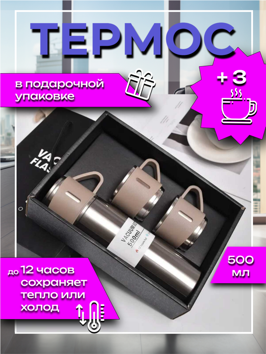 Отзывы на Термокружка, термос с кружкой, нержавеющая сталь, вакуумный термос, термос, набор термос с кружками, 0,5 л, серебристый