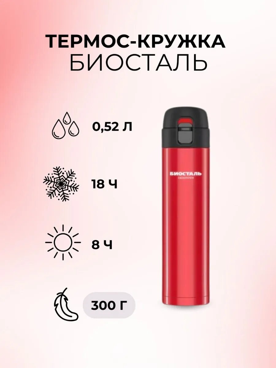 Термос-термокружка BIOSTAL, для чая и кофе, 520 мл, ударопрочный, вакуумная изоляция, красный информация: