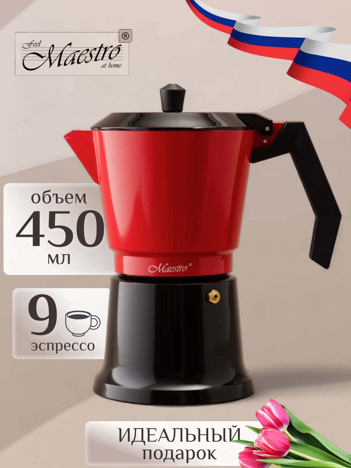 Гейзерная кофеварка Feel Maestro at Home, для 9 порций, красная/черный 450 мл информация:
