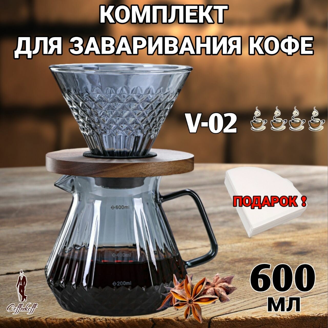 Набор для заваривания кофе, Воронка для кофе, чайник-сервер, стекло "Бриллиант" Серый информация: