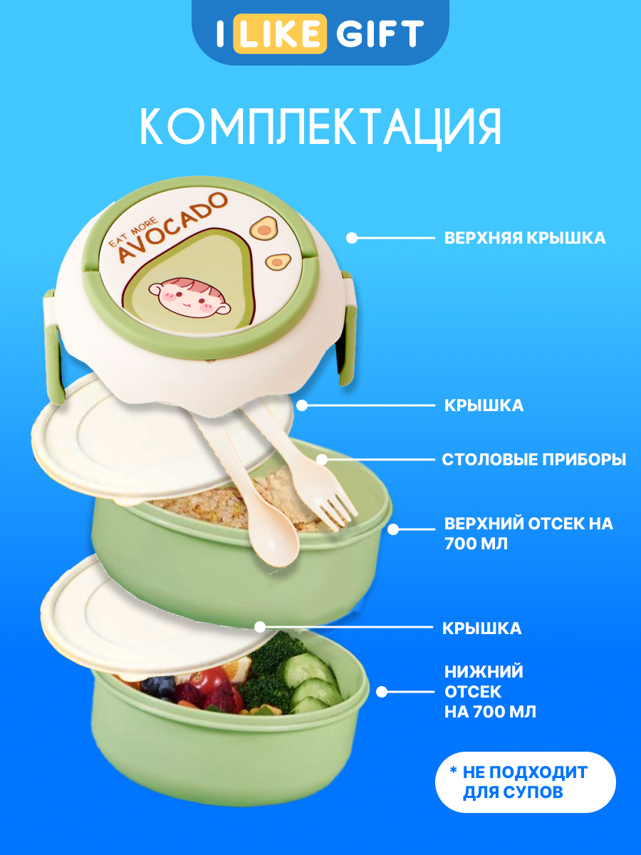 Отзывы на Ланч бокс "Circle eat more avocado" для еды двухъярусный с приборами, пищевой пластик, 1400 мл