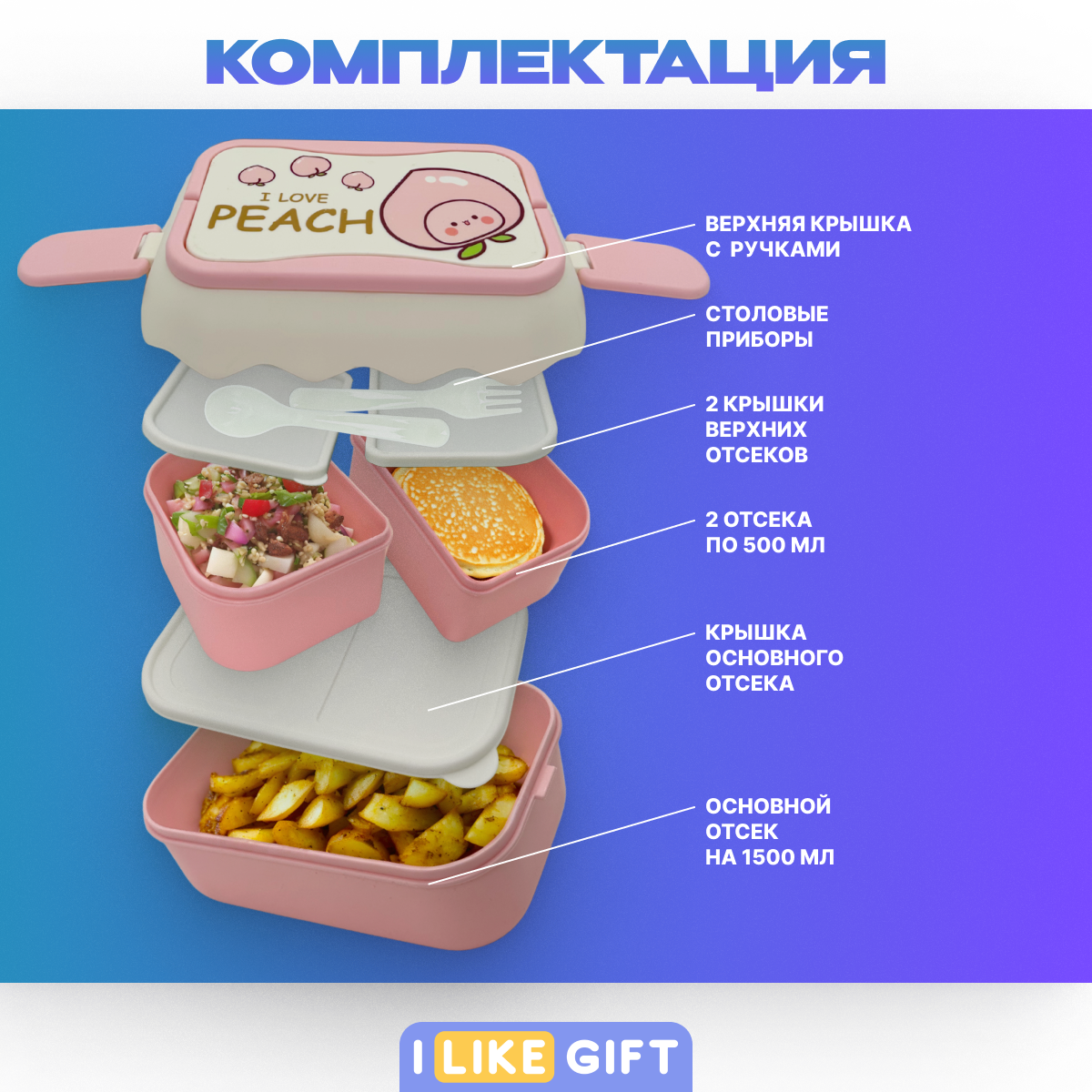 10 цен на Ланч-бокс с отделениями «I love Peach» и приборами, розовый персик, 2500 мл