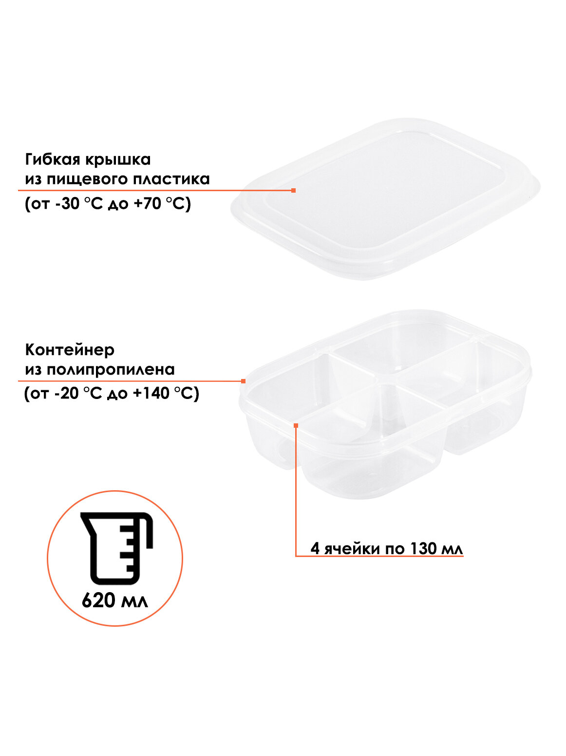 Контейнер для еды пластиковый с крышкой ланч бокс, 4 отделения, 620 мл; 17х12,7х4,9 информация: