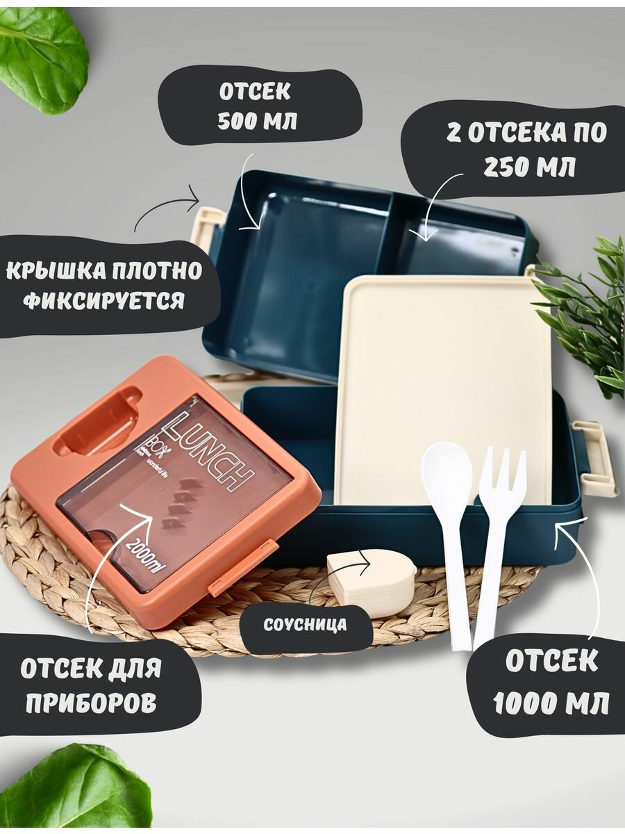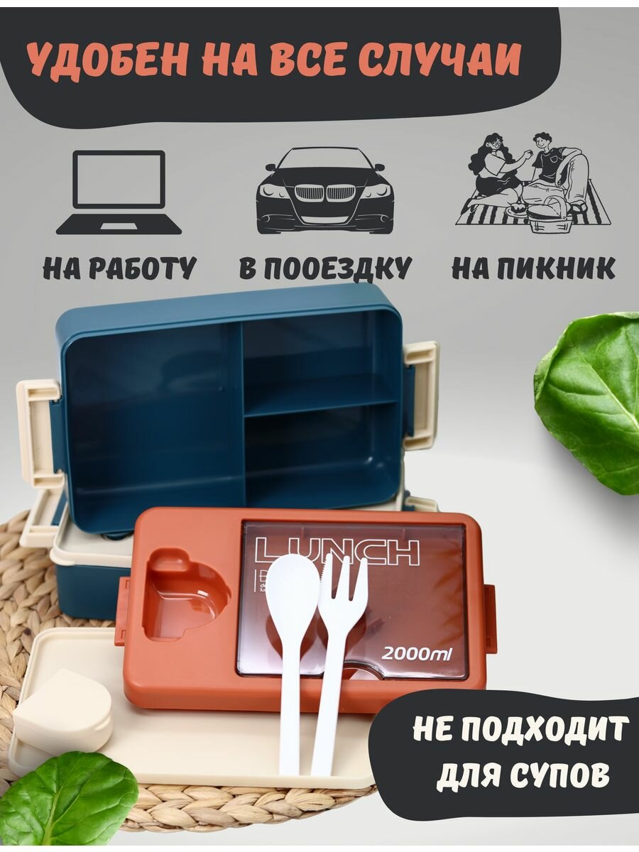 10 цен на Ланч-бокс "Food time" с отделениями, приборами и соусницей на работу, пластик, оранжевый/синий, 2000 мл