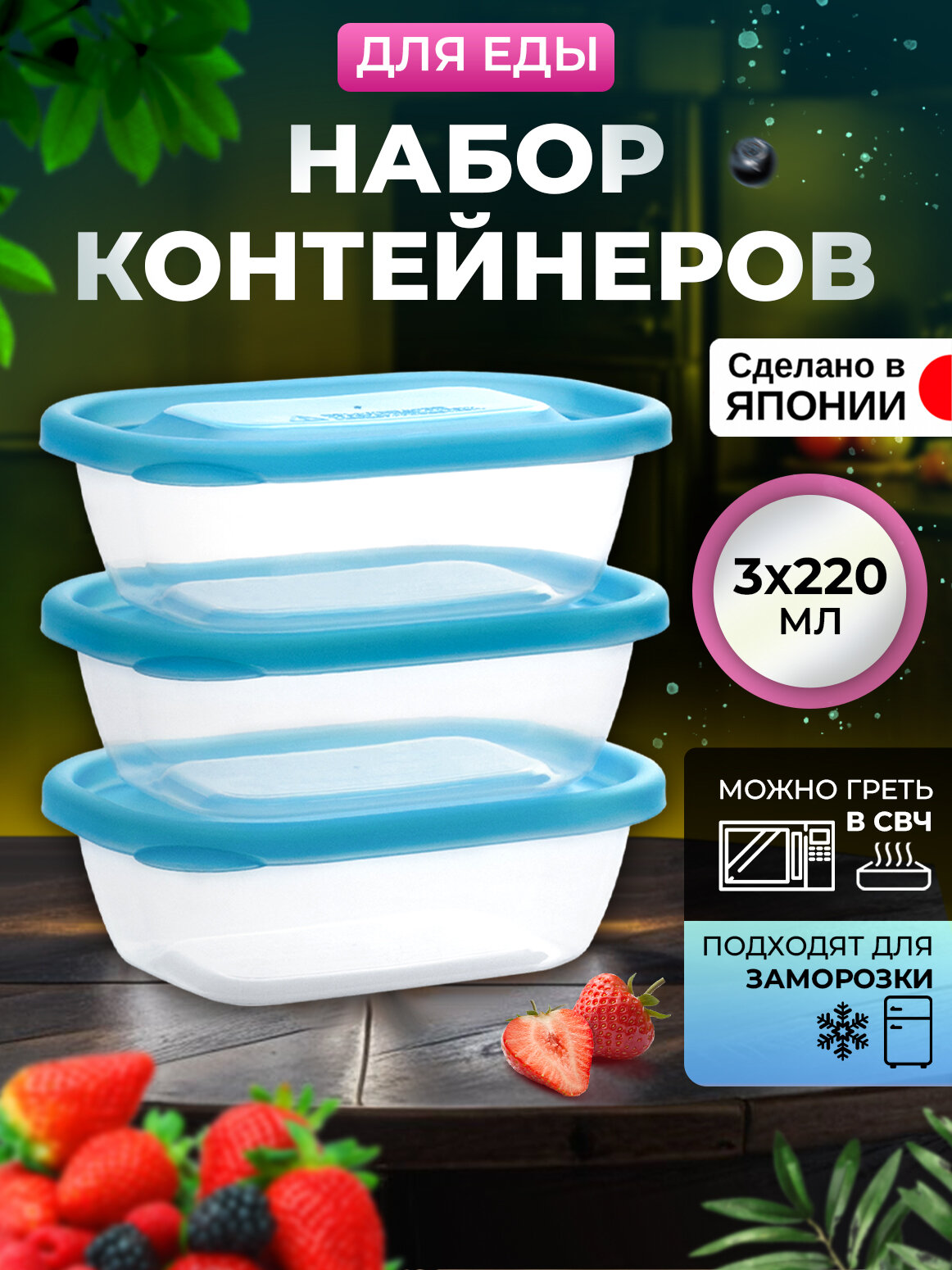 Контейнер для еды пластиковый с крышкой набор 3 шт, 220 мл (H), 12,8х9,2х4,1 см информация: