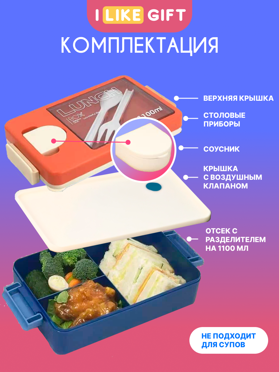 Ланч бокс "Tasty food" для еды с отделениями и приборами, пластик, 1100 мл информация: