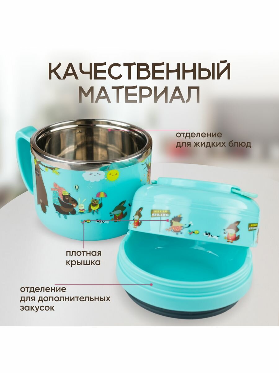 Lunch Box с тремя термо-контейнерами герметичными металл. отделениями для еды, супа, с термо-сумкой для школы 1.4л. Сталь внутри