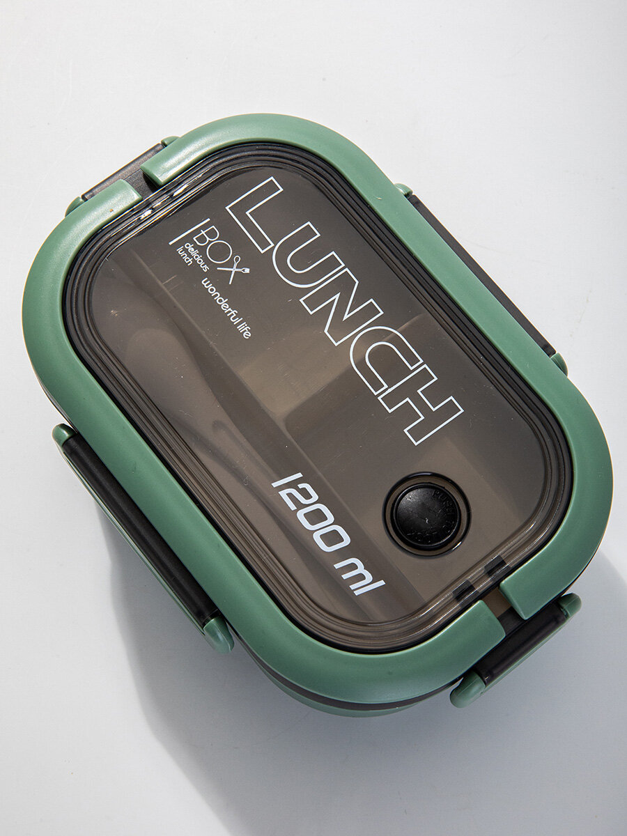 Ланч-бокс для еды пластиковый двухуровневый со столовыми приборами зеленый информация: