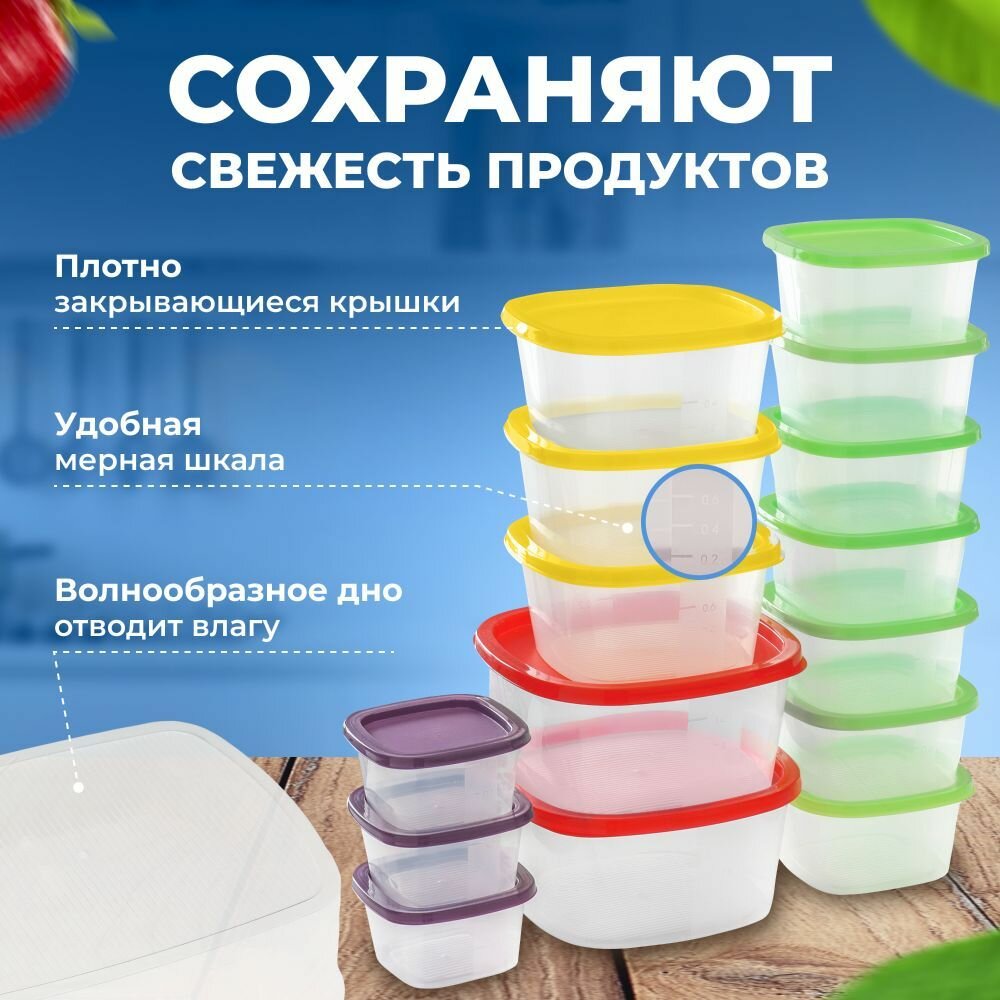 Контейнер для еды набор 15 единиц, "Sparkplast" квадратные с крышкой, пищевой пластик объёмом 0,23л 3 шт. 0,5л 7 шт. 0,9л 3 шт. 1,55л 2 шт. информация: