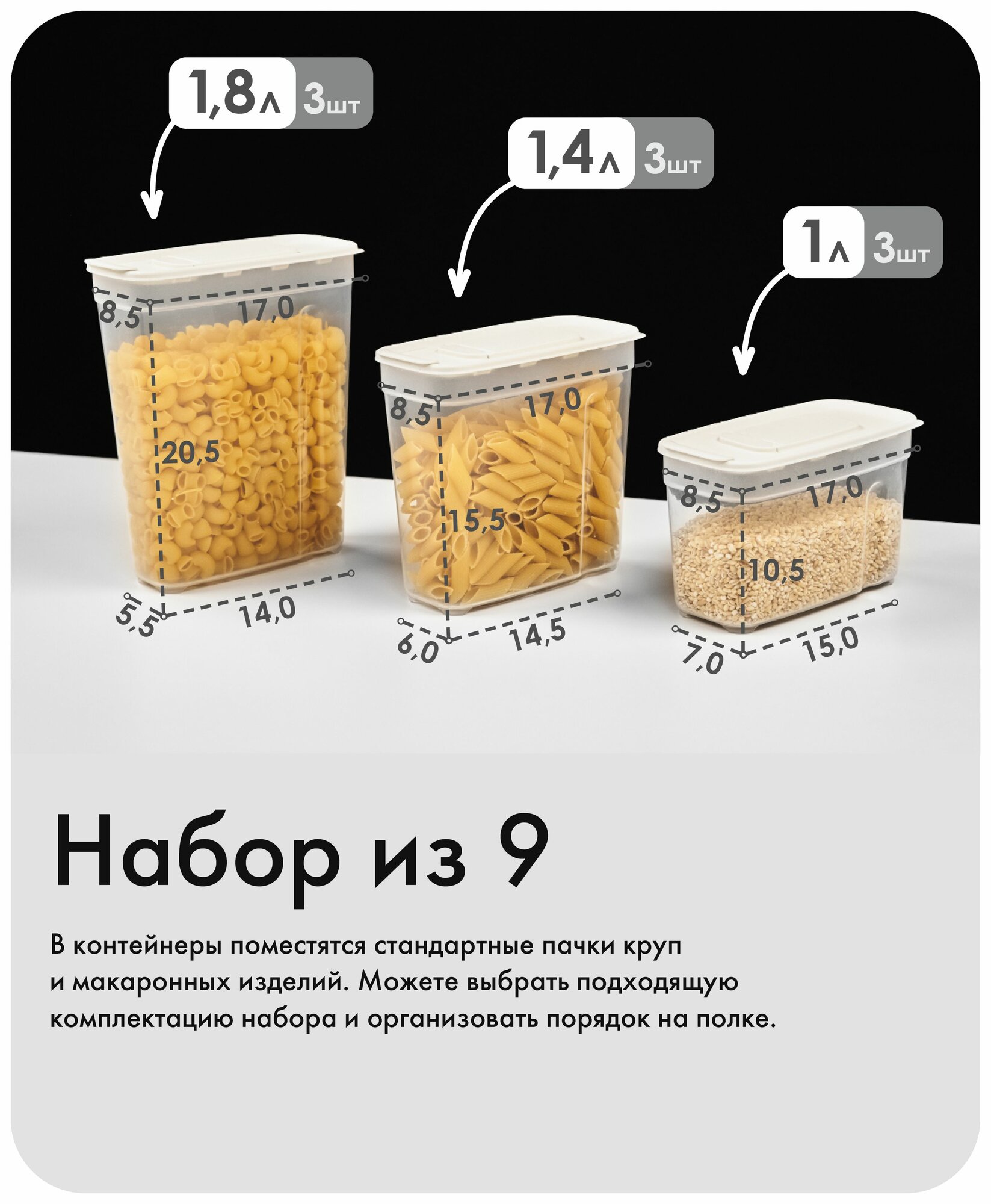 Набор контейнеров для сыпучих продуктов ( 1л - 3шт; 1,4л - 3шт; 1,8л - 3шт) (слоновая кость) информация: