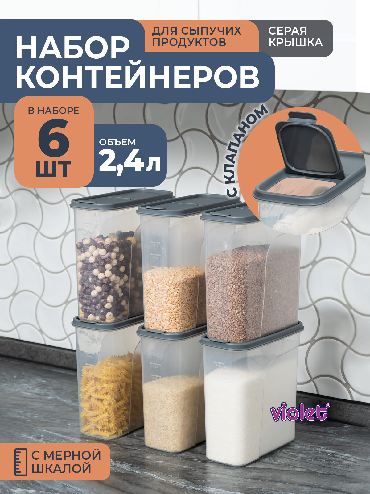 Банки для сыпучих продуктов 2,4л -6 шт, цвет серый / набор контейнеров для хранения информация: