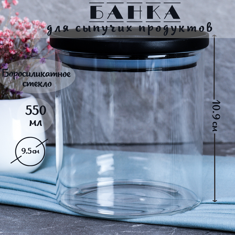 10 цен на Банка для хранения сыпучих 550 мл, 10х9,5 см, стекло, пластиковая крышка,