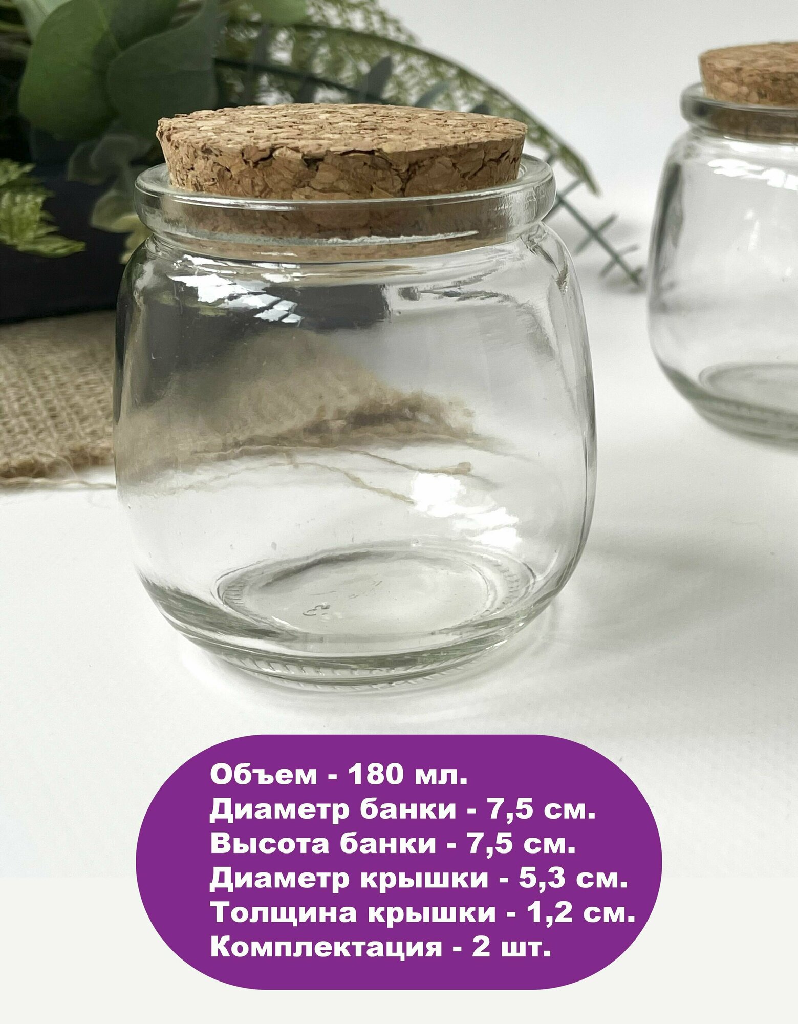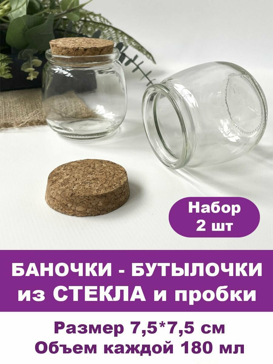 Баночки - бутылочки с пробкой, стеклянные, прозрачные 180 мл, 7,5*7,5 см, набор 2 штуки информация: