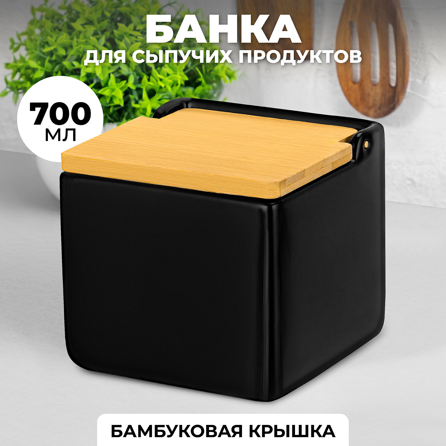 10 цен на Банка для хранения сыпучих продуктов 700 мл Elan Gallery Черная с откидной бамбуковой крышкой, керамика