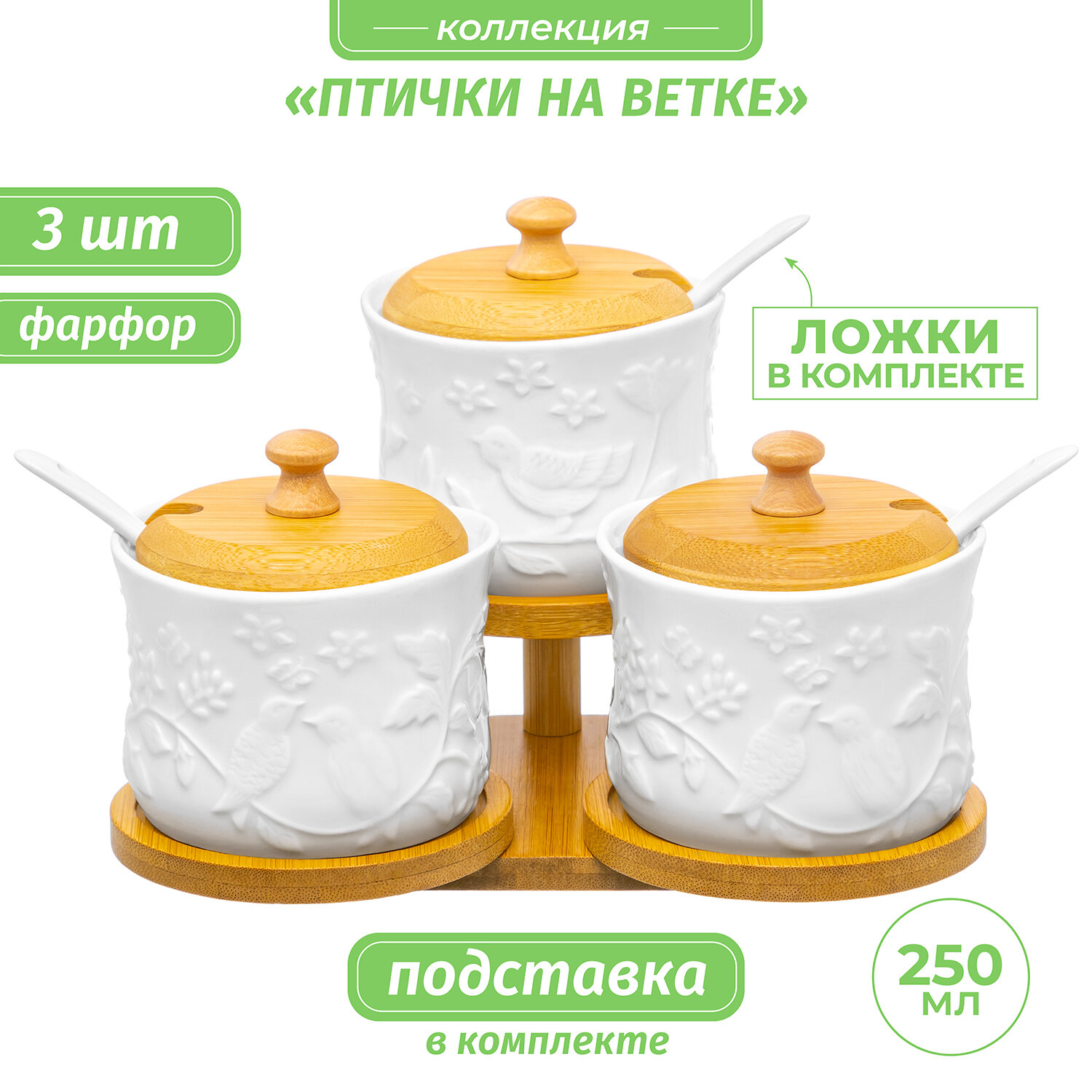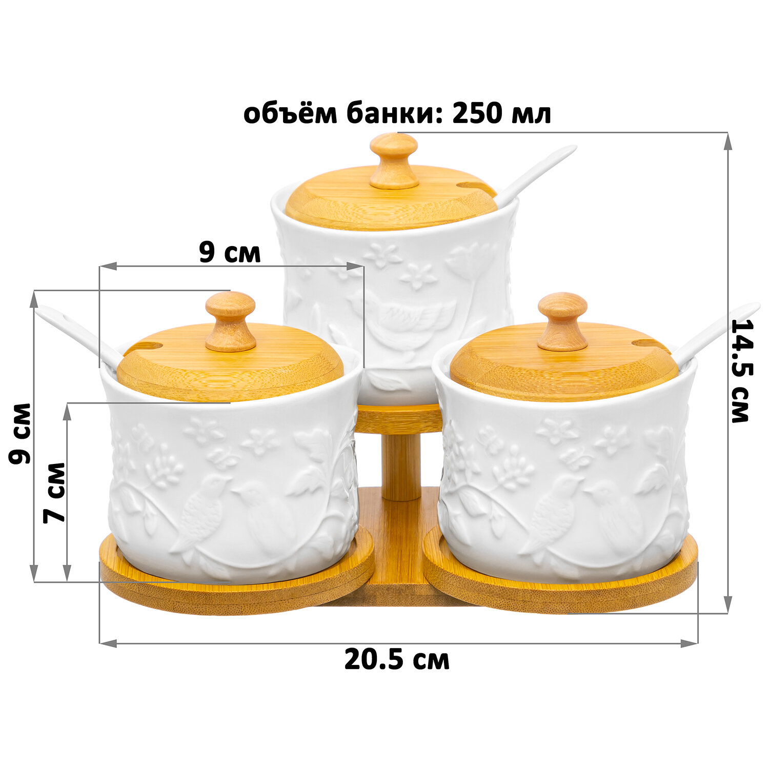 10 цен на Банка для хранения сыпучих продуктов, соли, специй 3 шт 250 мл Elan Gallery Птички на ветке + ложки, на подставке, набор