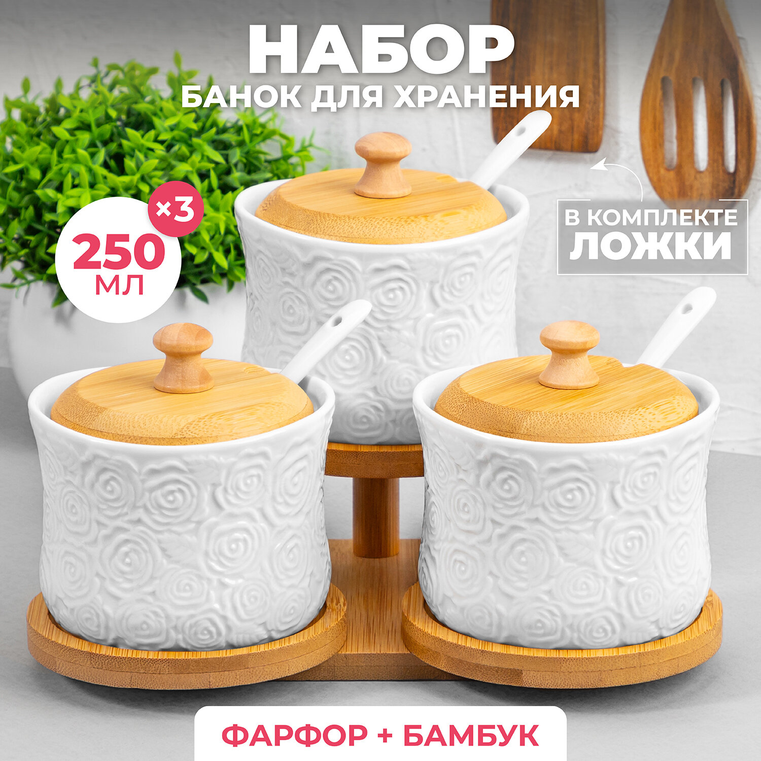Отзывы на Банка для хранения сыпучих продуктов, соли, специй, чая, кофе 3 шт 250 мл Elan Gallery Розы + ложки, на подставке, набор