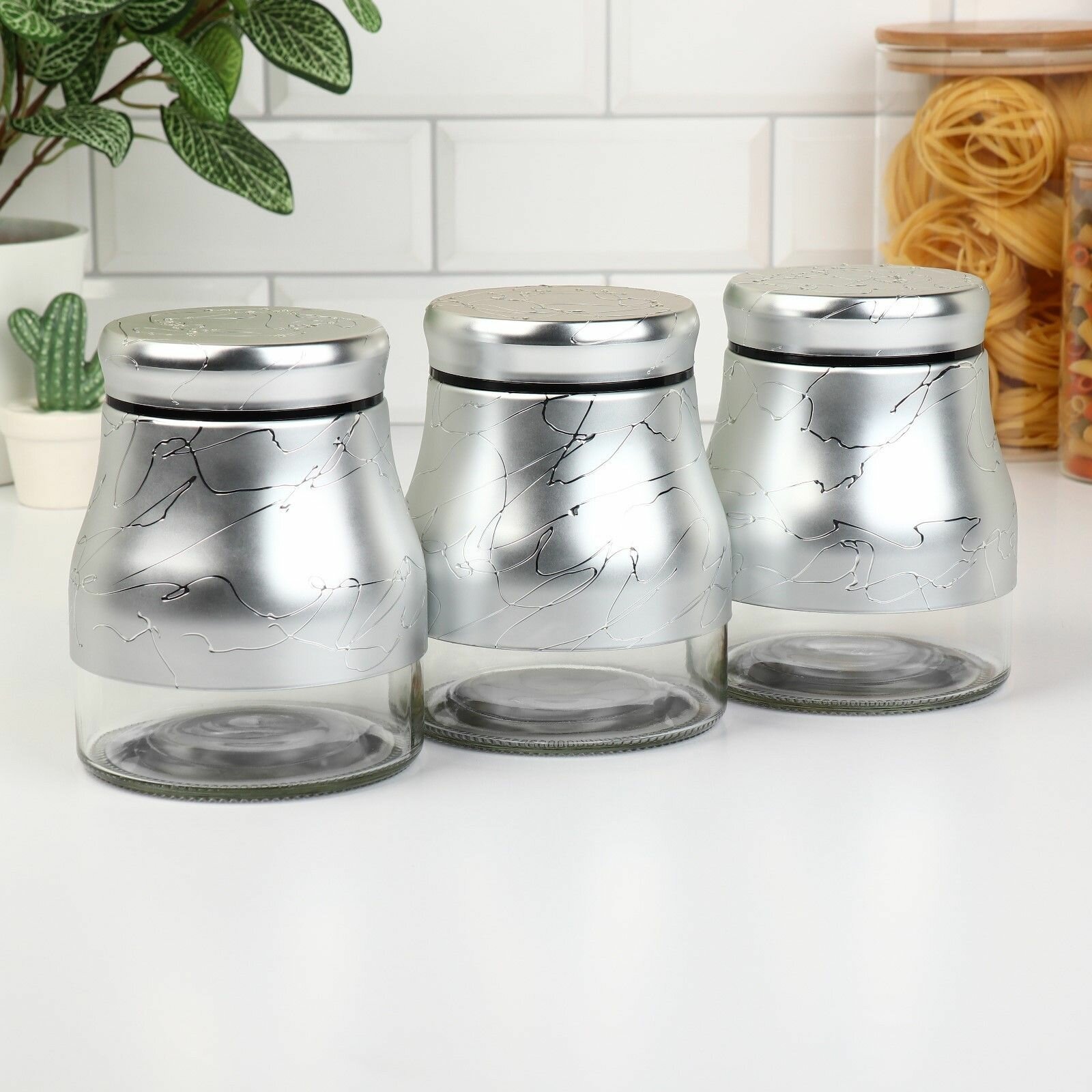 10 цен на Набор банок стеклянных для сыпучих продуктов "Мрамор", 850 мл, 11,5х14,5 см, 3 шт, цвет серебряный