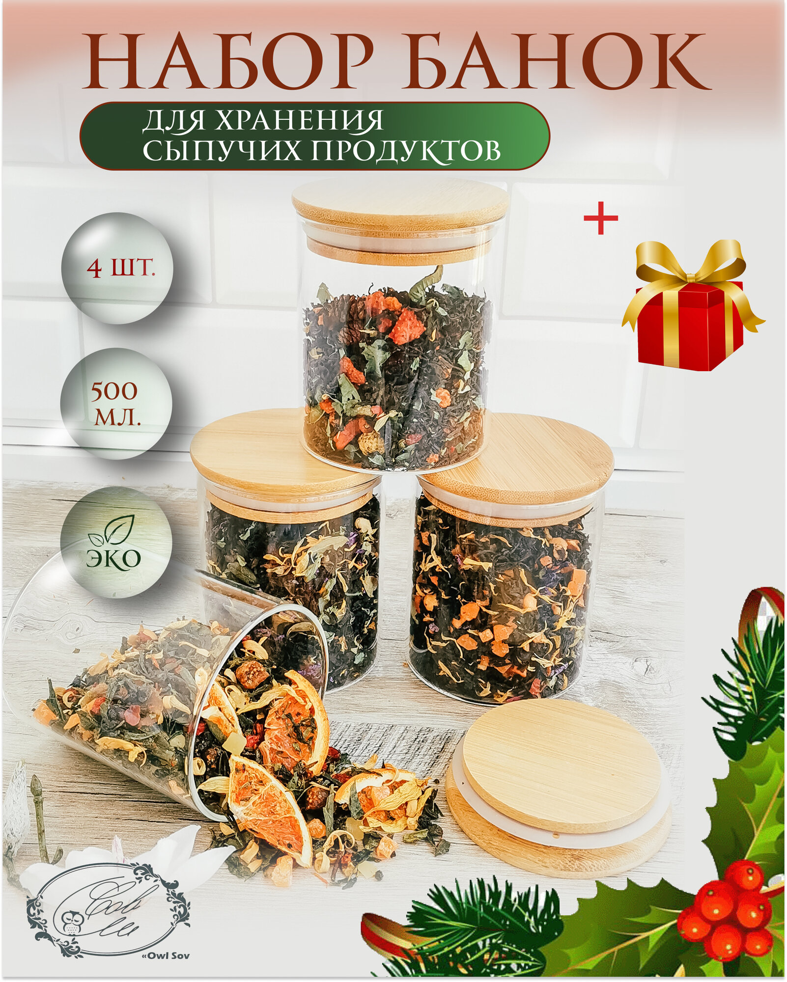 Набор банок для хранения сыпучих продуктов "Owl Sov", 500 мл, 4 шт, круглые банки с крышкой из бамбука, для чая, информация: