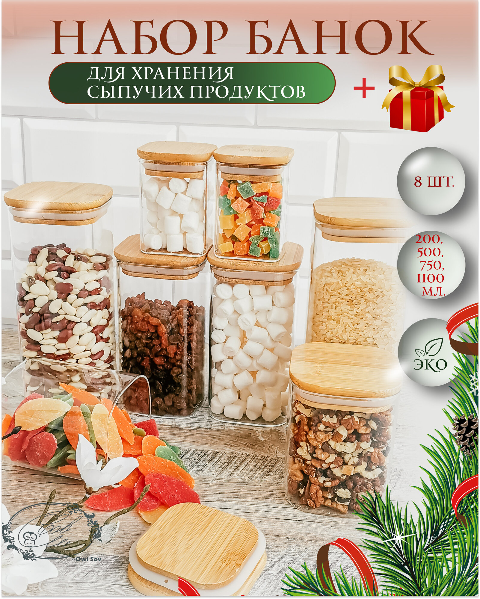 Отзывы на Банки квадратные для сыпучих продуктов Owl Sov, с деревянной крышкой из бамбука,200 мл 500 мл 750 мл 1100 мл, 8 шт,
