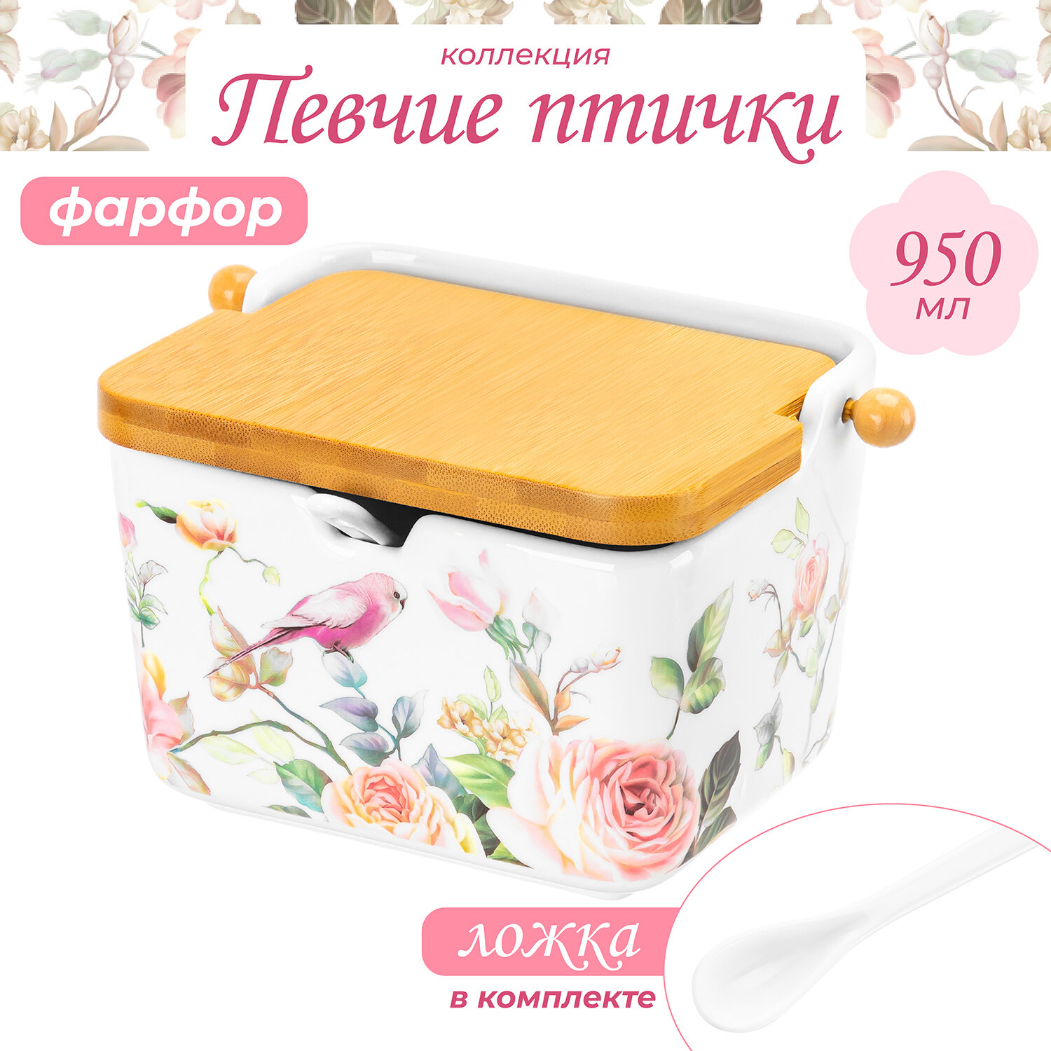 10 цен на Банка для хранения сыпучих продуктов 950 мл Elan Gallery "Певчие птички" +ложка+откидная бамбуковая крышка