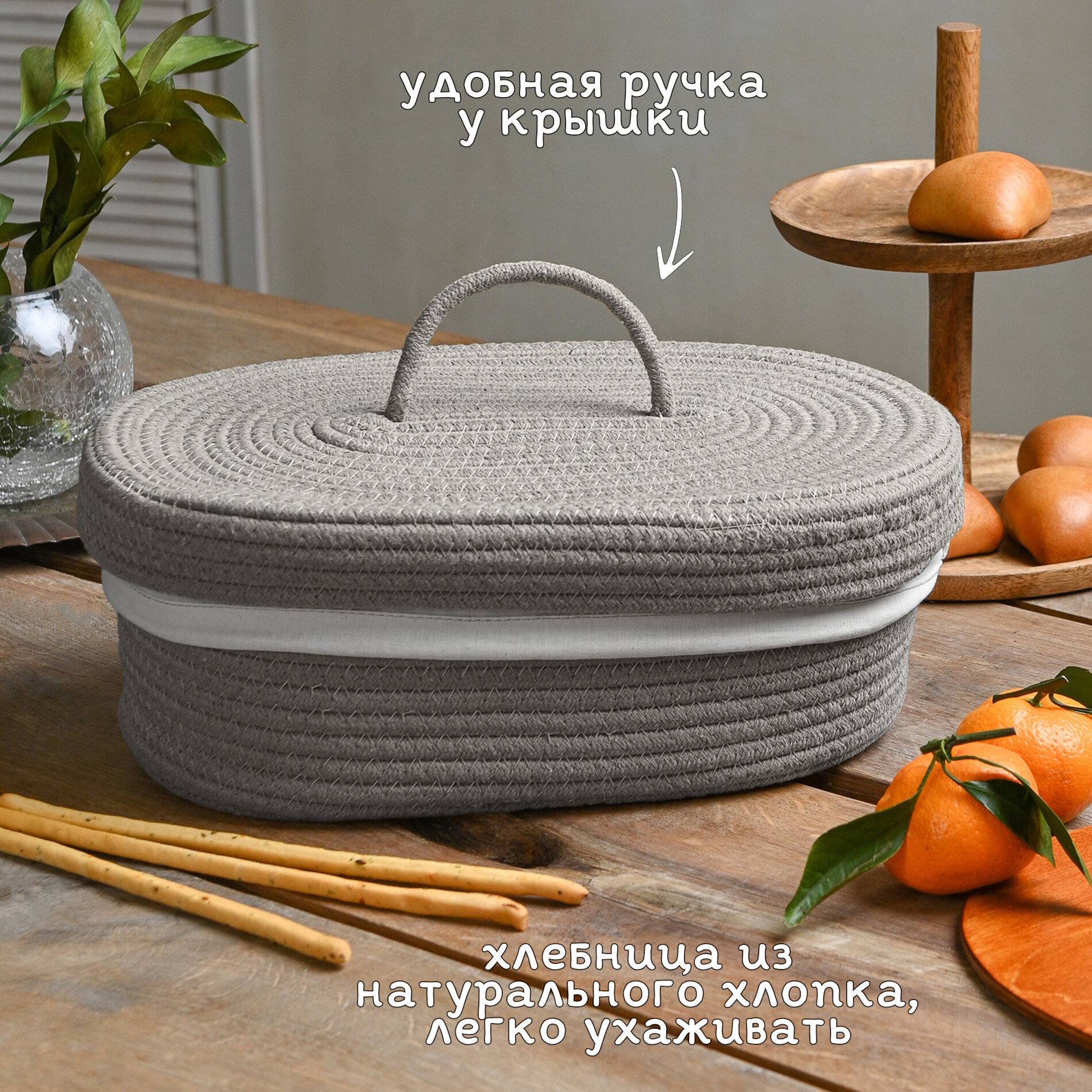 Хлебница плетеная с крышкой для хранения (серая) информация: