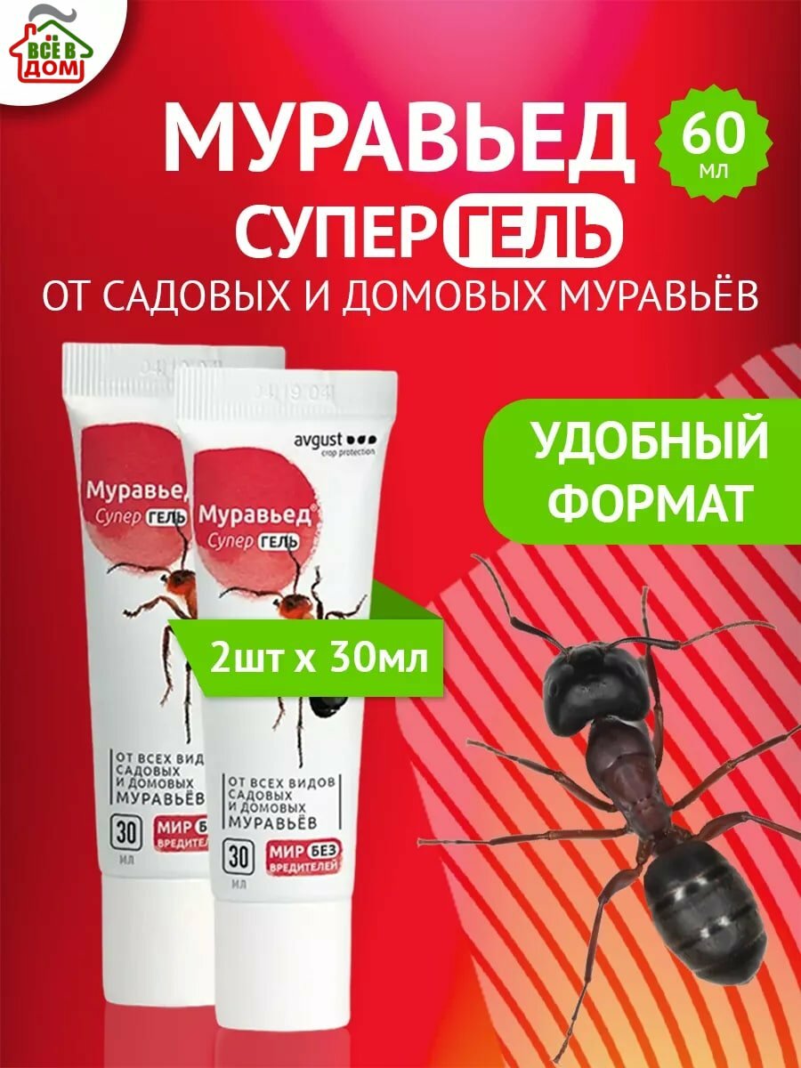 10 цен на Муравьед Супер Гель эффективное средство от садовых и домашних муравьев, туба 2 шт по 30 мл, Август